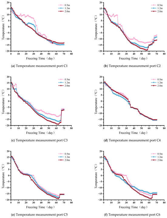 In the initial stage, the temperatures at each measurement point were approximately between 13 °C and 16 °C, with a slight increase in temperature as depth increased. Analyzing the temperature curves at different points within the same measurement well, it was found that the temperature changes at C1, C2, C3, C4, C5 and C7 followed Newton’s law of cooling and Fourier’s law of heat conduction. In the early freezing stage, the low-temperature brine in the freezing pipes continuously absorbed heat, leading to a rise in temperature. The cooling effect on the outer soil was less than that on the inner soil, resulting in a faster rate of temperature decrease at a depth of 0.5 m. However, after the freezing stabilized, the rate of temperature decrease at this depth slowed down due to its shallow burial and the rising ambient temperature during the monitoring period. Once the frozen soil curtain gradually formed, the temperature at the 0.5 m measurement point continued to decline. In contrast, the temperature data at depths of 1.2 m and 2 m were less affected by external factors, resulting in better freezing effects.