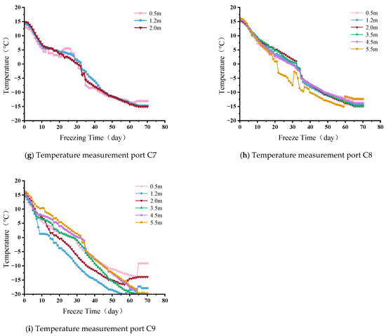 Temperature monitoring ports are arranged as shown in Figure 2 and Figure 3, with two positioned on the left line and seven on the right. Each tube contains a minimum of three sensors, enabling real-time observation of frozen wall development within the soil. This configuration also supports early assessment of frost heave and thaw settlement trends, facilitating timely interventions to regulate their progression and maintain construction safety. The detailed temperature readings from the nine monitoring points are presented in Figure 8.