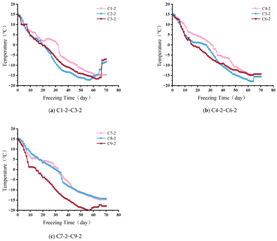 To assess the formation of the frozen soil curtain during construction, temperature data from different measurement holes buried at a depth of 2 m, which are more representative of actual conditions, were selected for plotting. The overall variation curve is shown in Figure 9. The temperature change at points C2-3 is relatively rapid. As seen in Figure 2 and Figure 3, the freezing pipes near this measurement hole are quite dense and located on the inner side of the frozen soil curtain, resulting in the best freezing effect in this area, with the fastest temperature drop and the lowest temperature recorded. Overall analysis indicates that since the range of soil encapsulated by the frozen soil curtain is limited, the temperatures at C2, C3, C5, C6 and C9 drop relatively quickly, indicating a better freezing effect. In contrast, C1, C4, C7 and C8 are located on the outer side of the frozen soil curtain, where the cooling provided by the freezing pipes is relatively less compared to the larger volume of soil on the outside that needs to absorb cold, resulting in a slower temperature drop.