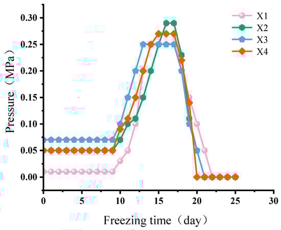 Four pressure relief holes were installed in this research. The location diagram of pressure relief holes X1–X4 is shown in Figure 3. Throughout the freezing process, as temperatures continuously decrease, the pore water pressure within the soil undergoes constant changes. The measured pressure data from these relief holes accurately reflect the formation and development of the frozen soil curtain, enabling assessment of whether the frozen soil curtain meets subsequent construction requirements. Monitoring for abnormal data can also facilitate early accident prevention, thereby reducing research risks. The pressure fluctuations at the four relief holes are illustrated in Figure 10.