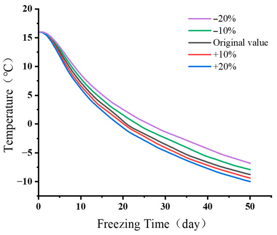 Figure 2 and Figure 3 show that the C8 temperature borehole lies on the outer side of the freeze curtain. Being farther from the freeze pipes than interior points, peripheral locations like C8 have temperature evolution that is more strongly controlled by soil thermophysical properties. By comparing the temperature data at point C8-2, it was found that the cooling patterns under different thermal conductivities exhibited a consistent trend. The rate of temperature decrease is directly proportional to the thermal conductivity, meaning that the higher the soil thermal conductivity, the faster the cooling rate. When the thermal conductivity increases by 20%, the temperature drops by 1.21 °C after fifty days of freezing. Conversely, when the thermal conductivity decreases by 20%, the temperature rises by 1.96 °C after the same freezing period. Additionally, under the same freezing time, the temperature changes caused by adjacent thermal conductivities are all less than 1.4 °C, indicating that the model parameter selection is reasonable. The temperature changes under different thermal conductivities are shown in Figure 11.