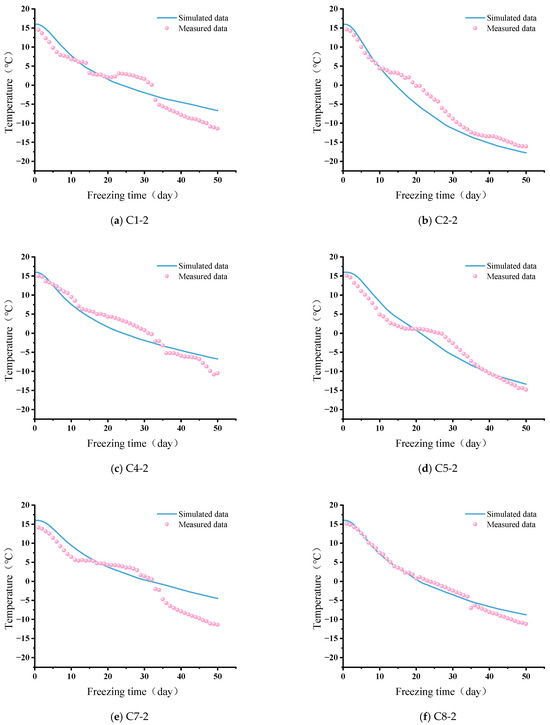 The data from measurement wells C6, C8 and C9 showed slight differences. For C6, the main reason was the dense distribution of freezing pipes at a depth of 0.5 m, which significantly improved the freezing effect. In contrast, the freezing pipes at depths of 1.2 m and 2 m were more sparse, leading to less effective freezing compared to the 0.5 m depth. For the data from measurement wells C8 and C9, the lower thermal conductivity of the peat soil compared to the silty clay and sandy soil resulted in a weaker ability to transfer heat, leading to a lower rate of temperature decrease.