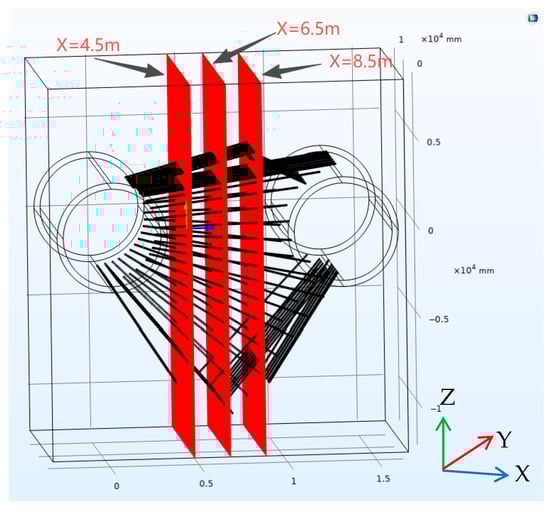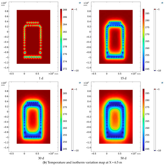 This analysis focuses on the cross-section at X = 6.5 m, which possesses spatial symmetry and is representative, allowing for a balanced reflection of the effects of the freezing pipes on both sides of the tunnel. This reduces the unilateral boundary effects and more accurately demonstrates the general shape and core characteristics of the frozen curtain in the cross passage.