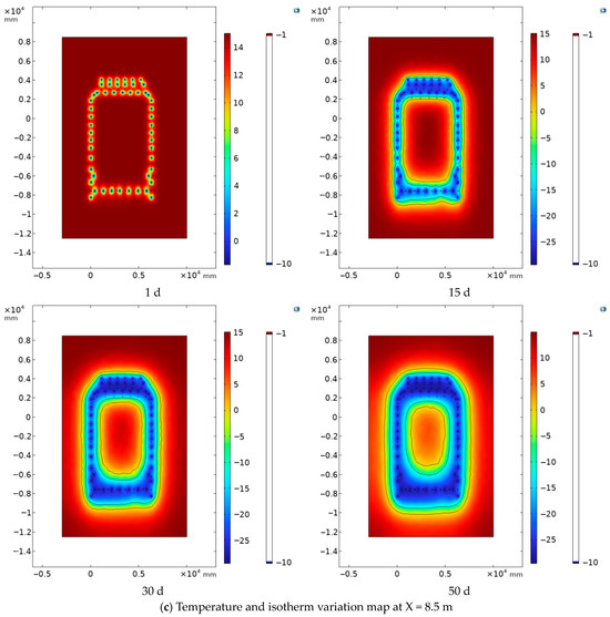 In the model, the YOZ of the vertical freezing pipe was selected as the working plane (Figure 13). Three cross-sections were chosen—X = 4.5 m (near the left-line tunnel), X = 6.5 m (model center), and X = 8.5 m (near the right-line tunnel)—to study temperature variation patterns and isothermal line distributions across these sections (Figure 14). Analysis of the temperature variation contour maps reveals identical development patterns across all three sections. Following the initiation of freezing, the soil layer adjacent to the outer wall of the freezing pipe first cools. This triggers a phenomenon where the frozen zone continuously expands outward from the freezing pipe as its center. As cold energy is continuously introduced, the cylindrical frozen zones gradually intersect, forming a relatively stable frozen soil curtain. Subsequently, this frozen soil curtain continues to absorb cold energy, leading to its ongoing expansion. The overall shape of the frozen soil curtain reveals that the distribution density of the freezing tubes on the left and right sides is lower than that on the top and bottom. Consequently, the amount of cold energy transferred through the freezing tubes on the left and right sides is relatively lower compared to the top and bottom. Therefore, the frozen soil curtain at each cross-section exhibits a shape that is wider at the top and bottom and narrower on the left and right sides [26].