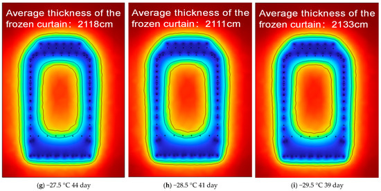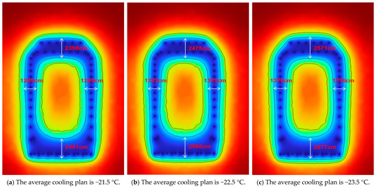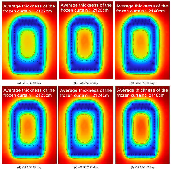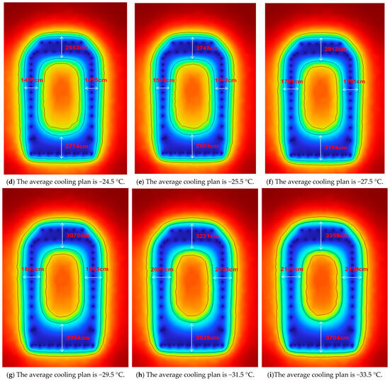 The temperature contour map at the X = 6.5 m cross-section reveals that the frozen soil curtain thickness exceeds its design value after freezing completion. To investigate the impact of cooling schedules on the final frozen soil curtain formation and the closure time of the frozen soil curtain, multiple simulation experiments were conducted. These experiments used the actual cooling schedule as a baseline while adjusting each day’s schedule (simultaneously raising or lowering the temperature by the same amount). The resulting final frozen soil curtain configuration is shown in Figure 15.