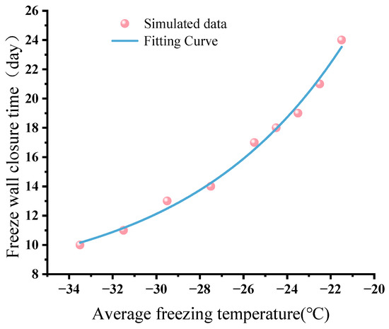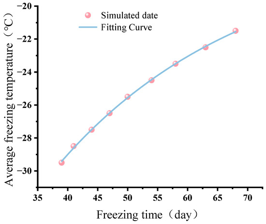 Figure 16 and Figure 17 illustrate the variations in average thickness and cycle time of the frozen soil curtain under different cooling schedules. The initial scatter plots reveal that when temperatures fall below the actual cooling plan, the rate of decrease in frozen soil curtain closure time slows. Conversely, when temperatures exceed the actual cooling plan, the frozen soil curtain closure time progressively extends. This occurs because the actual cooling plan provides sufficient refrigerant cooling capacity to support complete frozen soil curtain formation. Consequently, further reductions in the overall cooling plan yield diminishing effects on frozen soil curtain closure time. Conversely, as the overall cooling plan temperature increases, less cooling capacity accumulates in a short time, prolonging the time required to form a complete frozen soil curtain [35]. By fitting data from various scenarios, the functional relationship between the average cooling plan temperature and the frozen soil curtain closure time is obtained as: