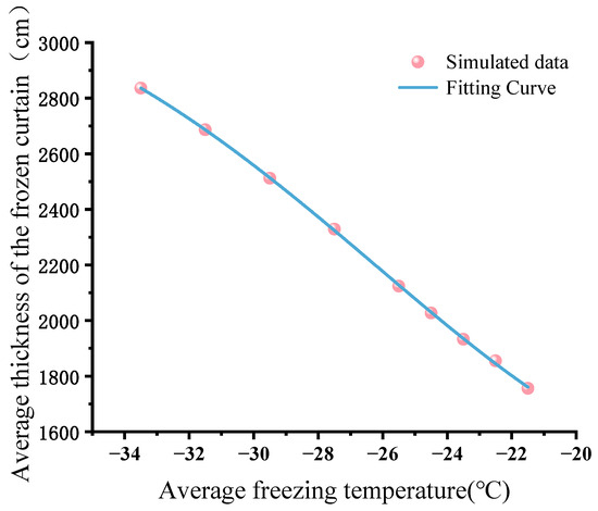 In the formula: is the average thickness of the frozen soil curtain; is the average temperature in the cooling plan; = 43,308.52; = −14.85; = 22.62; = −52,158.22.