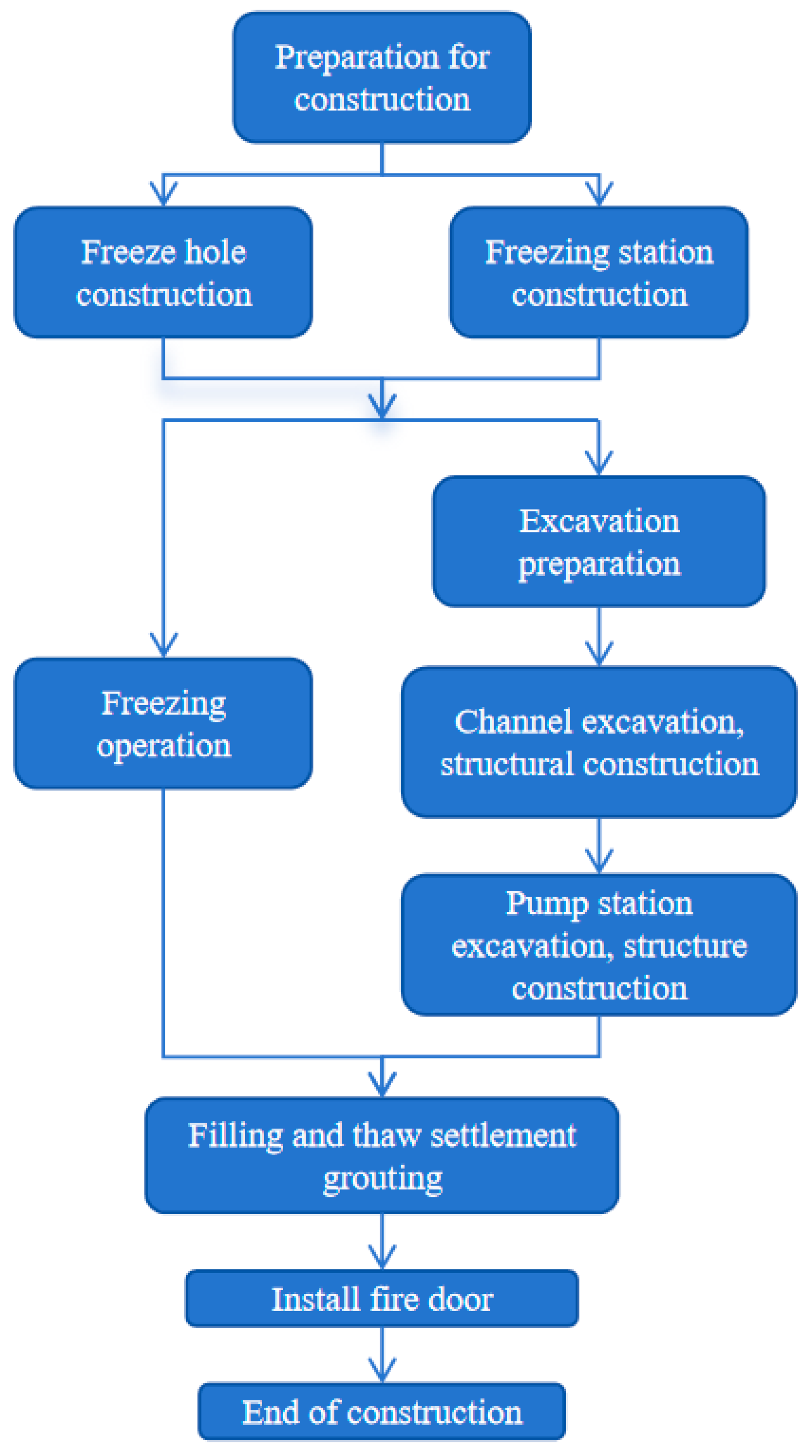 When the cross passage is constructed using the freezing method, it mainly includes the following stages: drilling operations for freezing holes, operation of the artificial freezing system in the strata, excavation of the passage, and construction of the structure. Once the main structure is completed and its strength meets the specified standards, backfilling and grouting work must be carried out promptly. The specific construction process can be referenced in