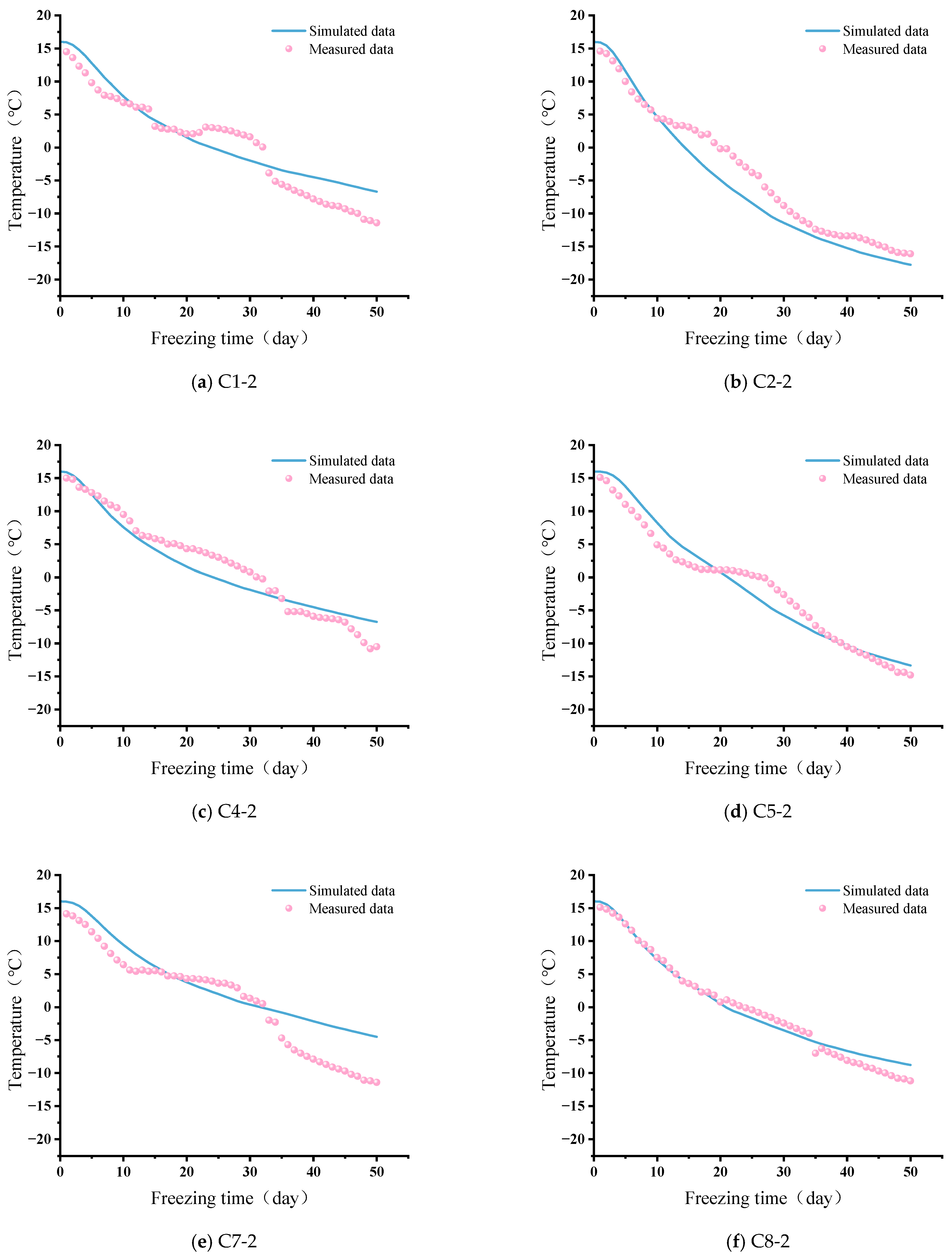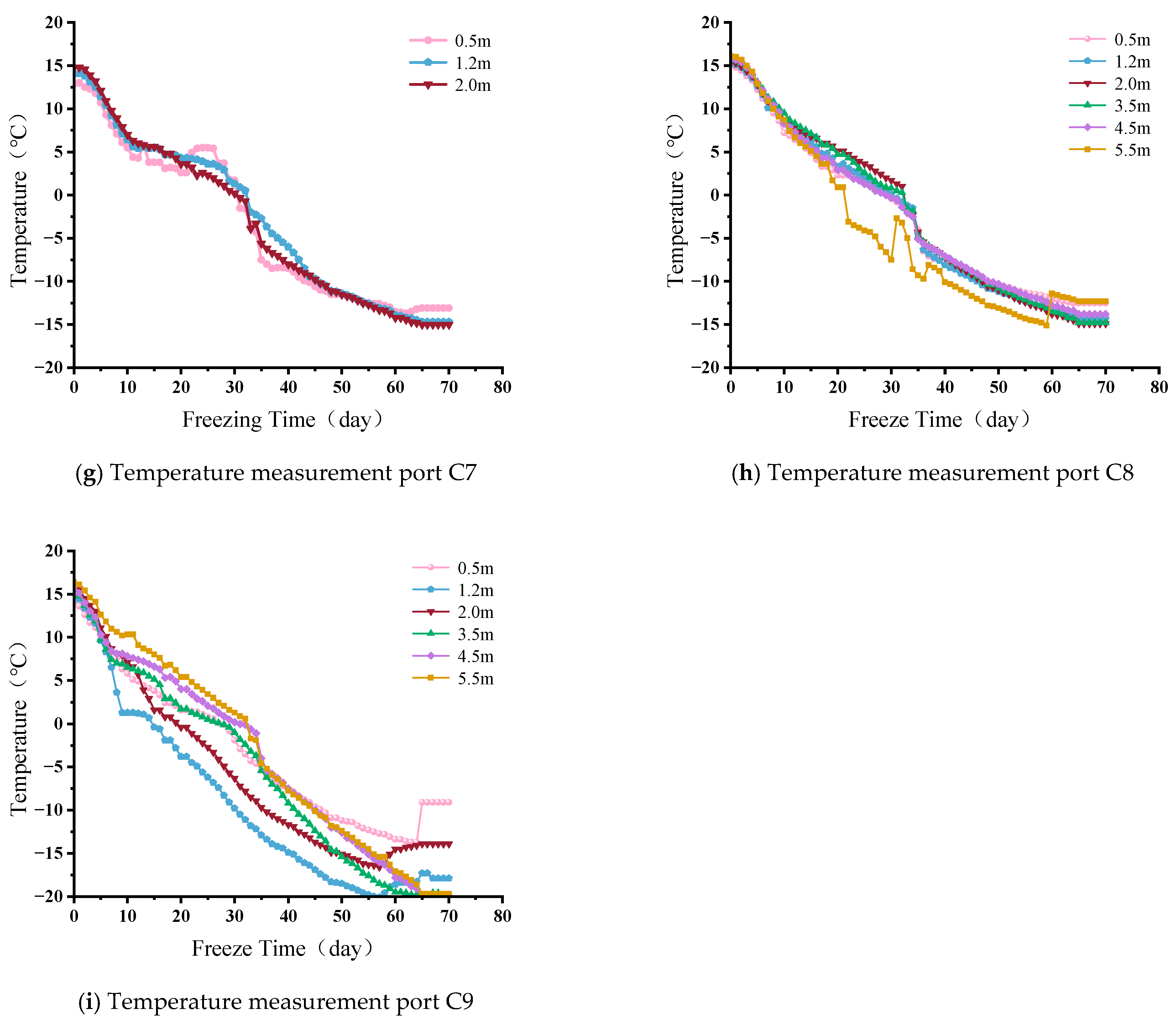 The data from measurement wells C6, C8 and C9 showed slight differences. For C6, the main reason was the dense distribution of freezing pipes at a depth of 0.5 m, which significantly improved the freezing effect. In contrast, the freezing pipes at depths of 1.2 m and 2 m were more sparse, leading to less effective freezing compared to the 0.5 m depth. For the data from measurement wells C8 and C9, the lower thermal conductivity of the peat soil compared to the silty clay and sandy soil resulted in a weaker ability to transfer heat, leading to a lower rate of temperature decrease.