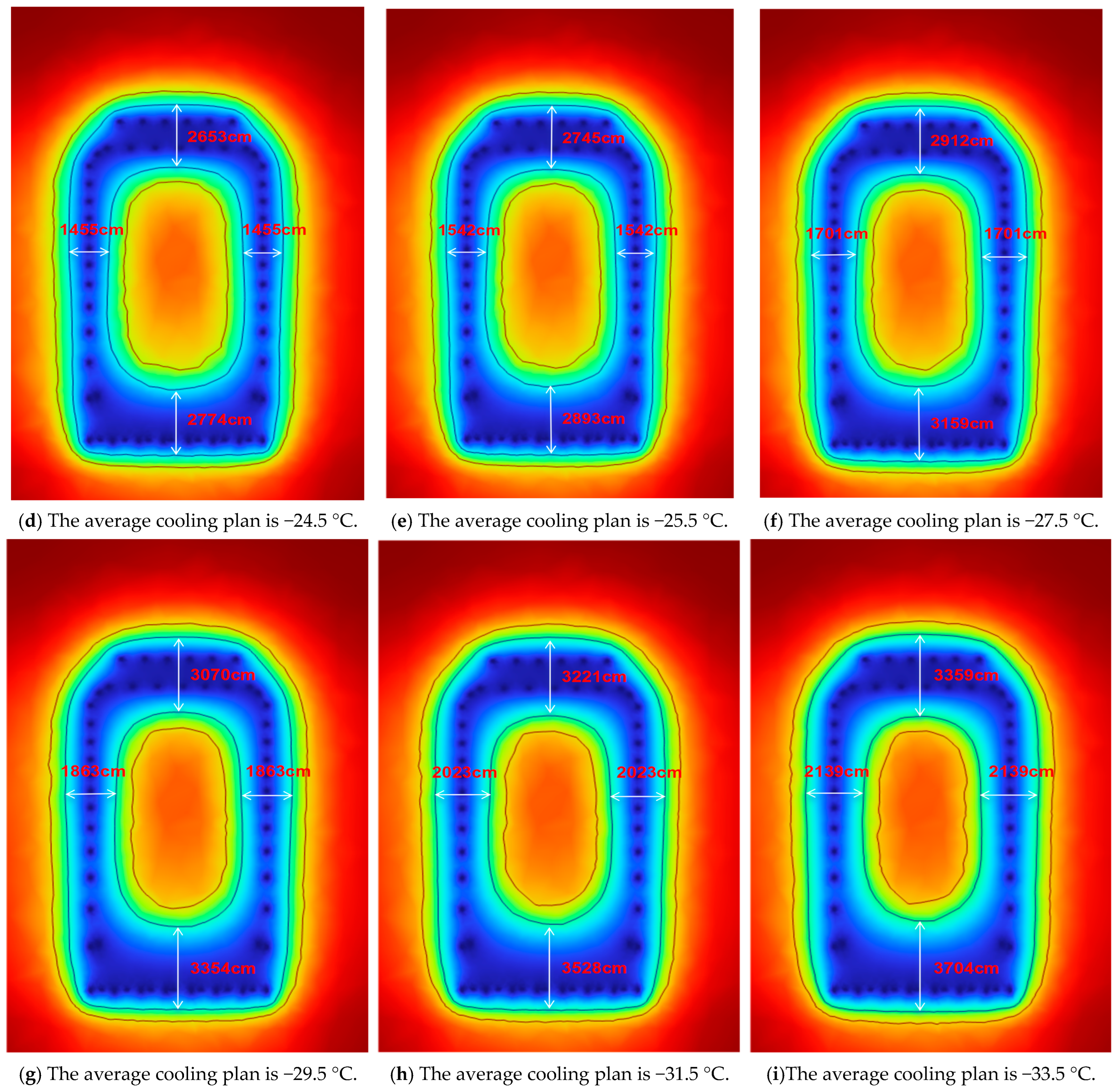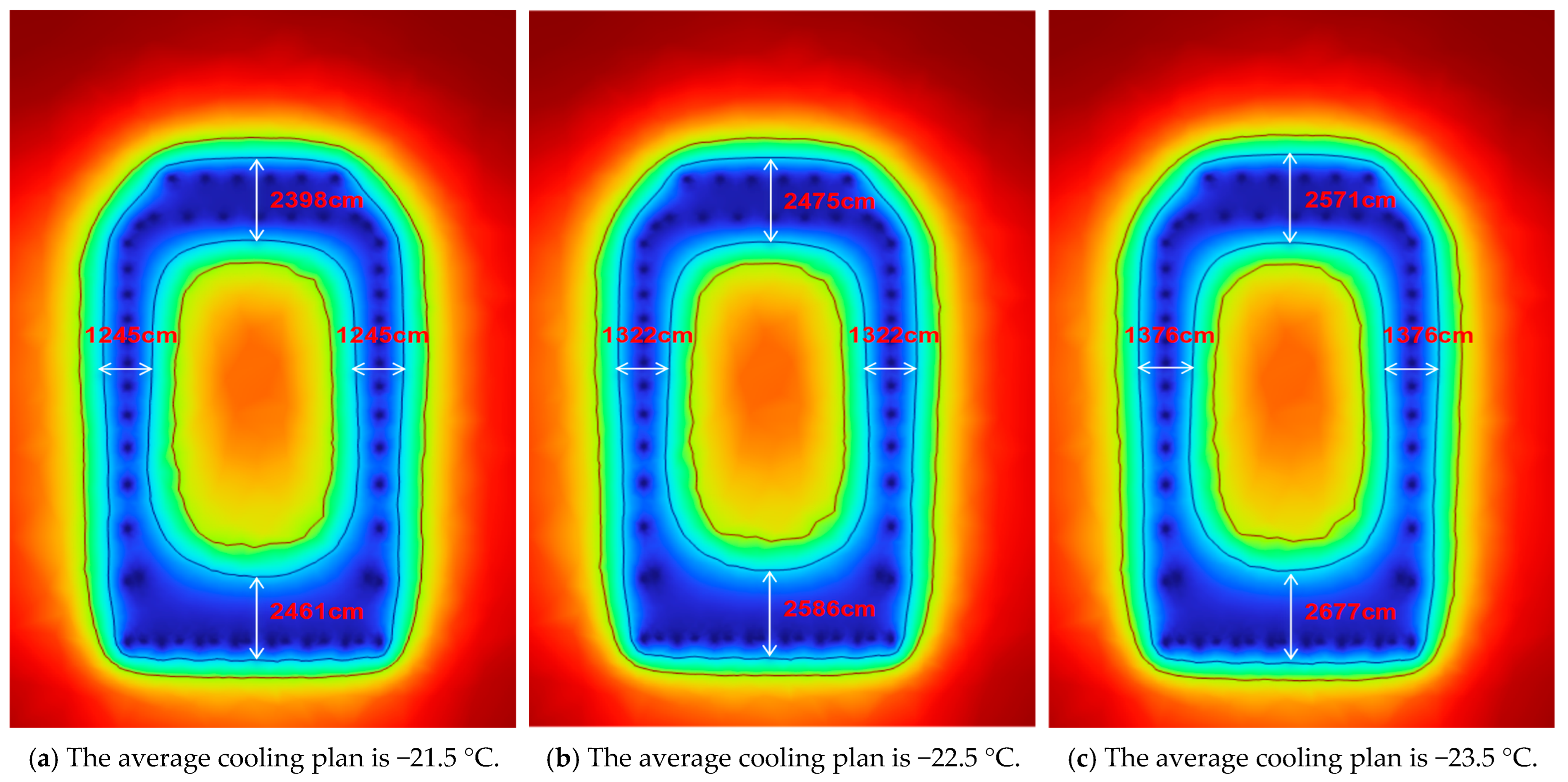 By observing the actual cooling plan, the average thickness of the frozen soil curtain areas far exceeding the design requirement of 2.1 m. To avoid excessive energy loss during the freezing process, simulations were conducted on nine different cooling plans to analyze variations in the average thickness of the frozen soil curtain. Through functional calculations, an economically viable cooling plan that meets the research’s design requirements can be identified.