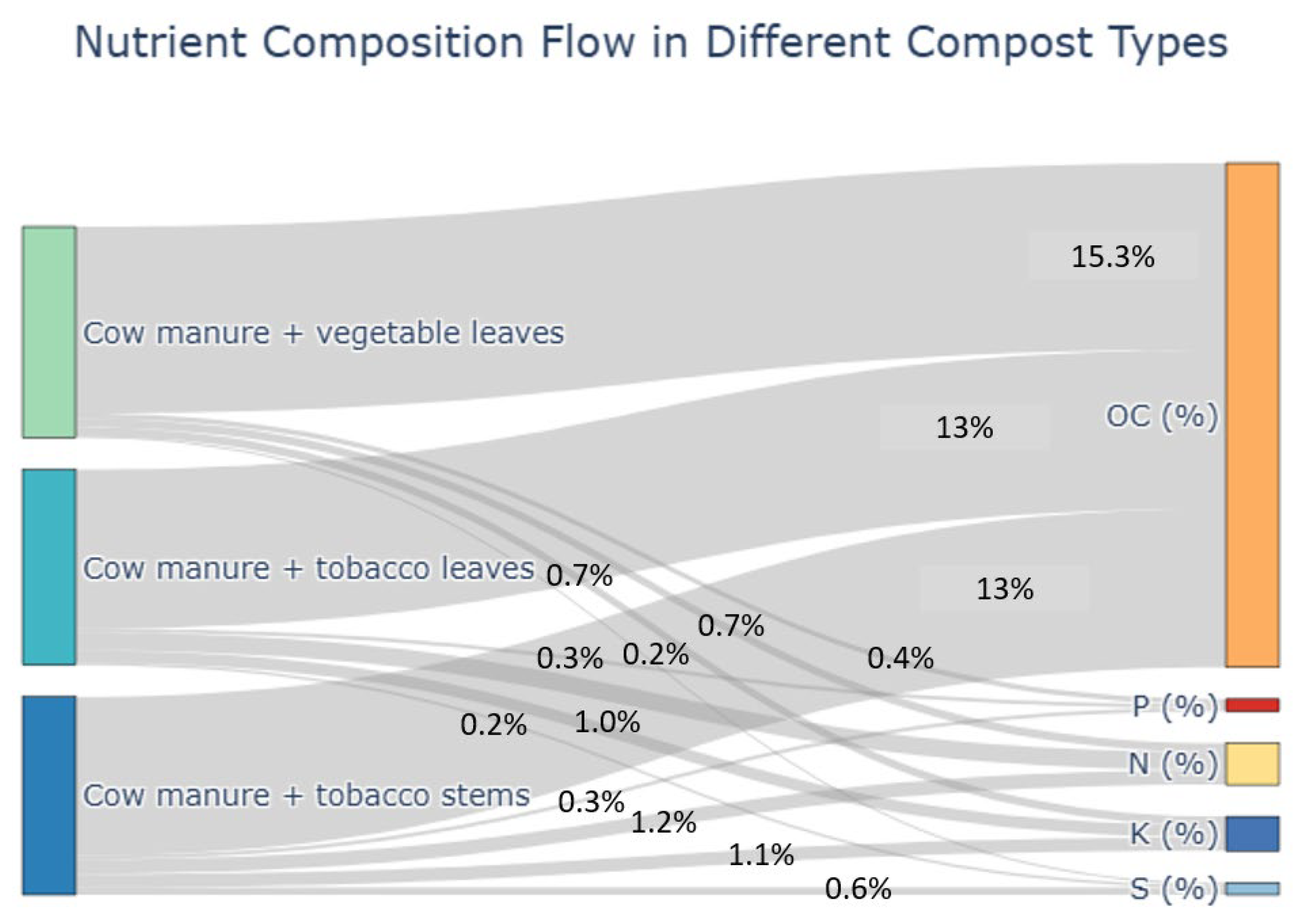 | China—Di et al., 2022 [50] | Fresh tobacco leaves and soil | Co-composting lasted for nearly 10 months | Nitrogen and available potassium increased by roughly 157% and 132%. Pseudomonas, Azotobacter, and Coprinus increased by roughly 244%, 323%, and 675% | Nicotine content decreased dramatically | Stimulate the growth of tobacco plants | Demonstrates the feasibility of tobacco leaf composting. |