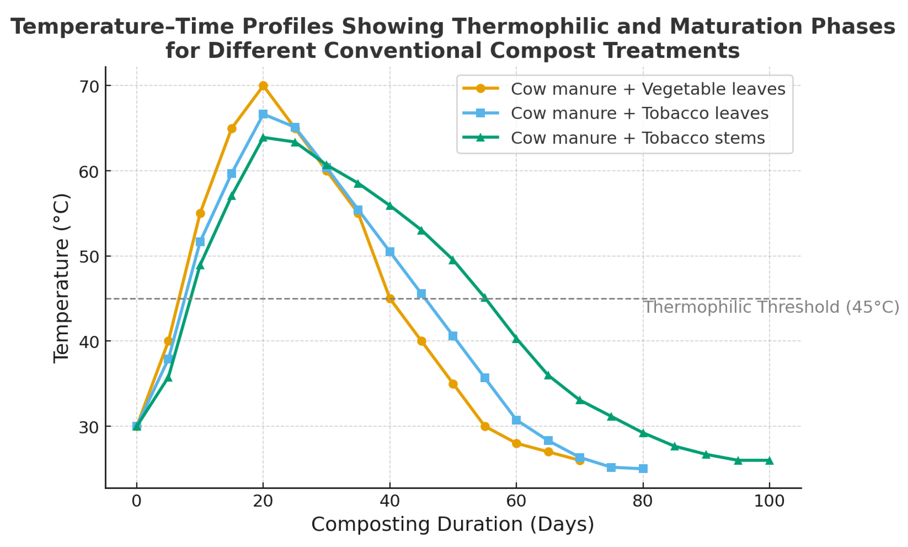 | Cow manure | Tobacco leaves | 17.56:1 (Cow manure), 70.67:1 (Tobacco leaves) | 4:1 | 70.24:4 + 70.67:1 = 140.91:5 | 28.18:1 | Suitable for composting (within 25–35:1 range) |