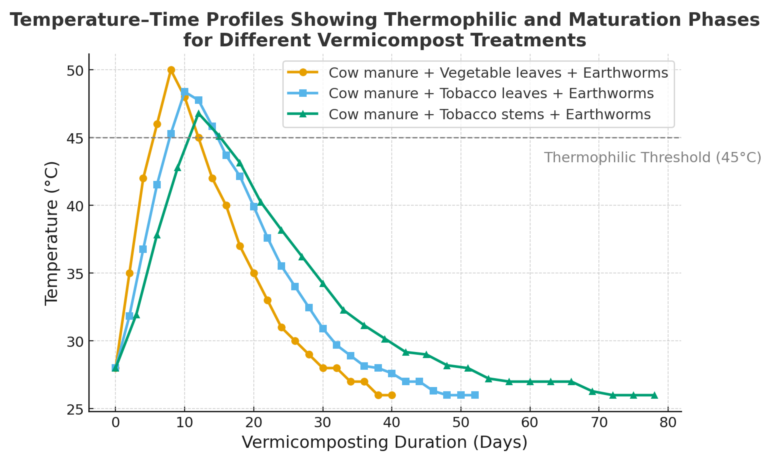 | Bangladesh (This Study) | Cow manure with (i) tobacco leaves, (ii) tobacco stems, (iii) vegetable leaves, and (iv) earthworms | Compost: 70–104 days; Vermicompost: 40–79 days | Vermicompost has a higher nutrient content than conventional compost. Tobacco stems have higher N, K, and S content compared to vegetable leaves. | Nicotine/phytotoxicity not measured | No crop yield test | Smallholder demonstration study |