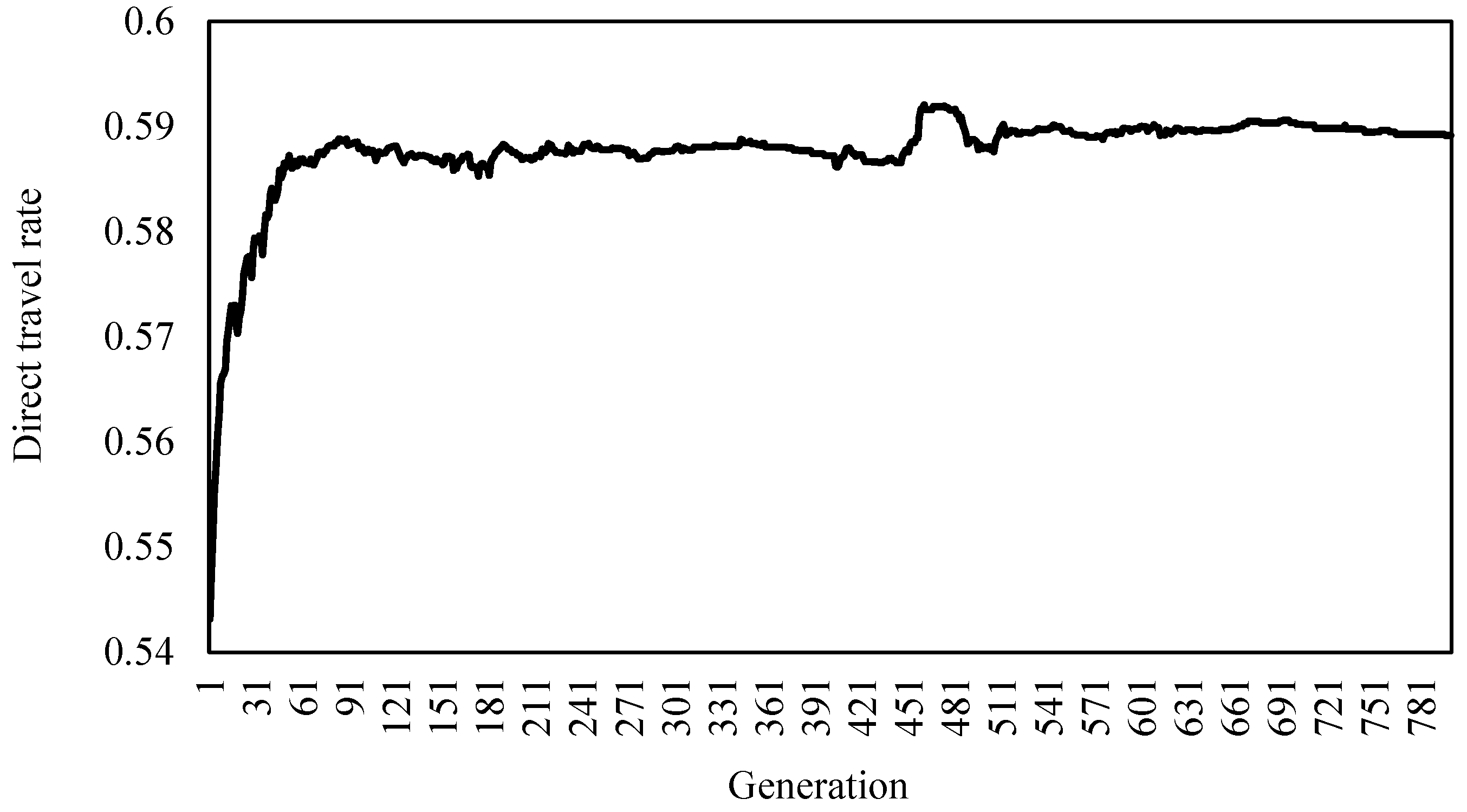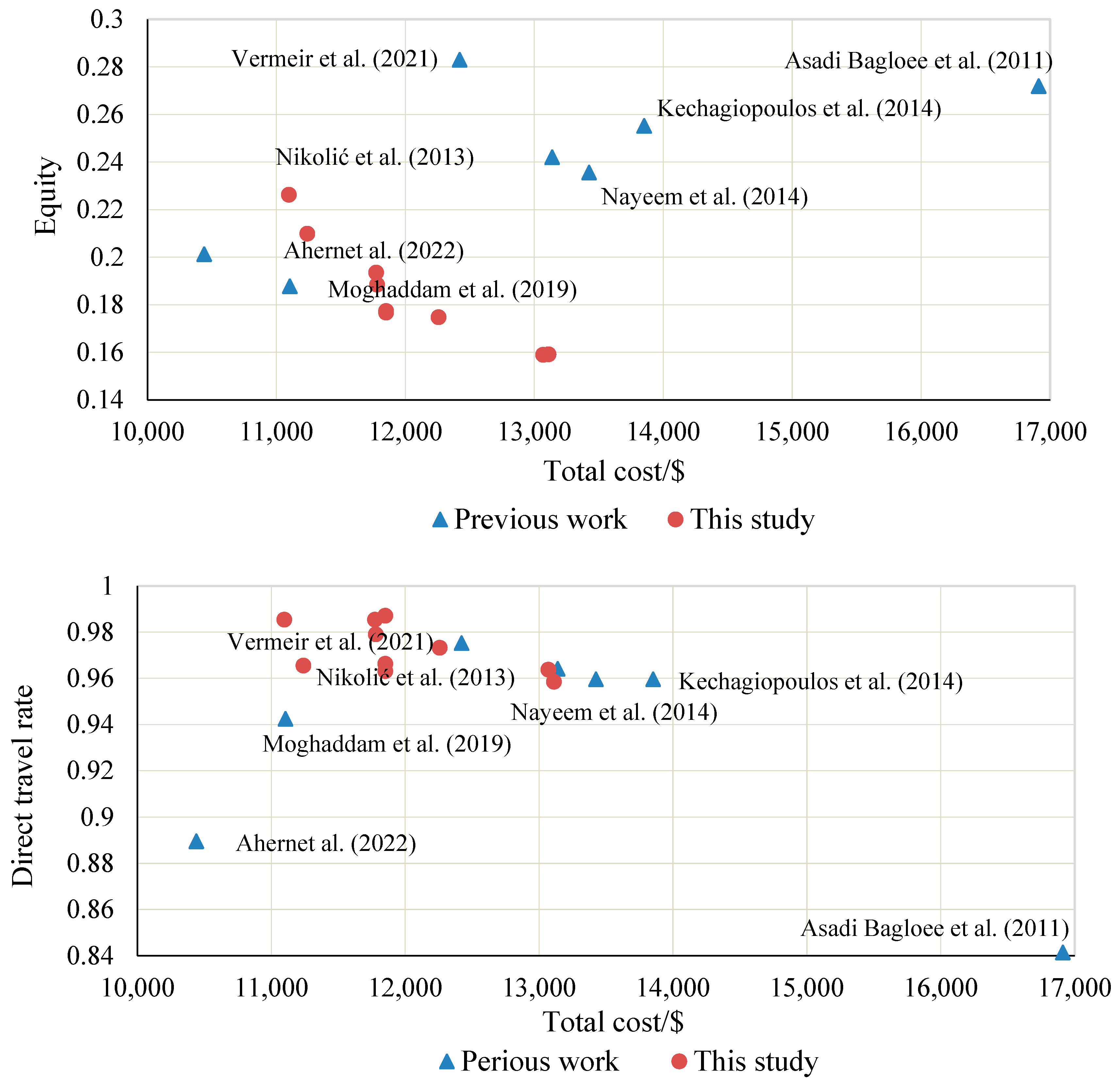 | Solution | Algorithm | Number of Bus Routes | Total Cost (Dollar) | Equity | Direct Travel Rate | Fleet Size | Total Operating Time (min) |