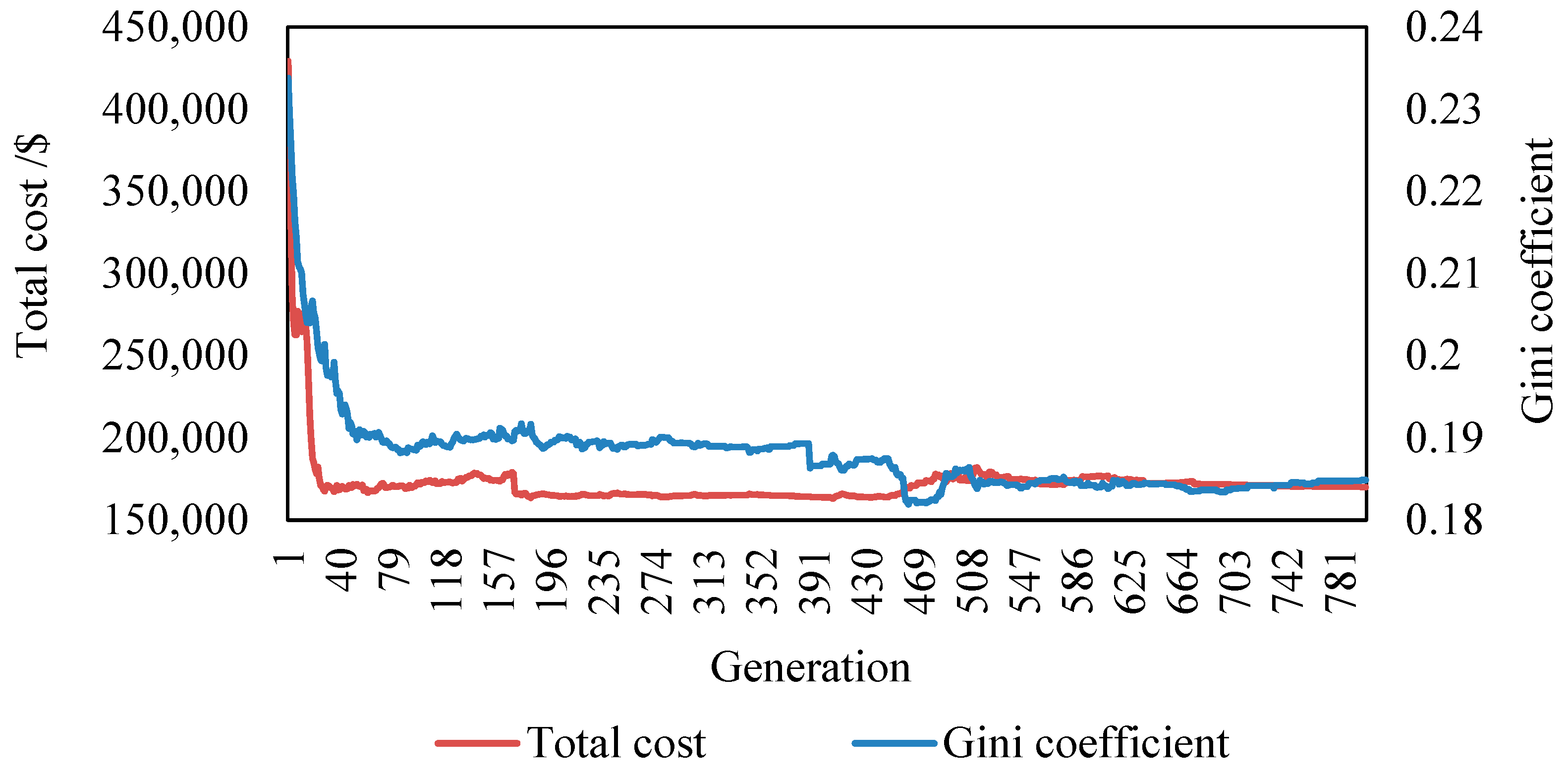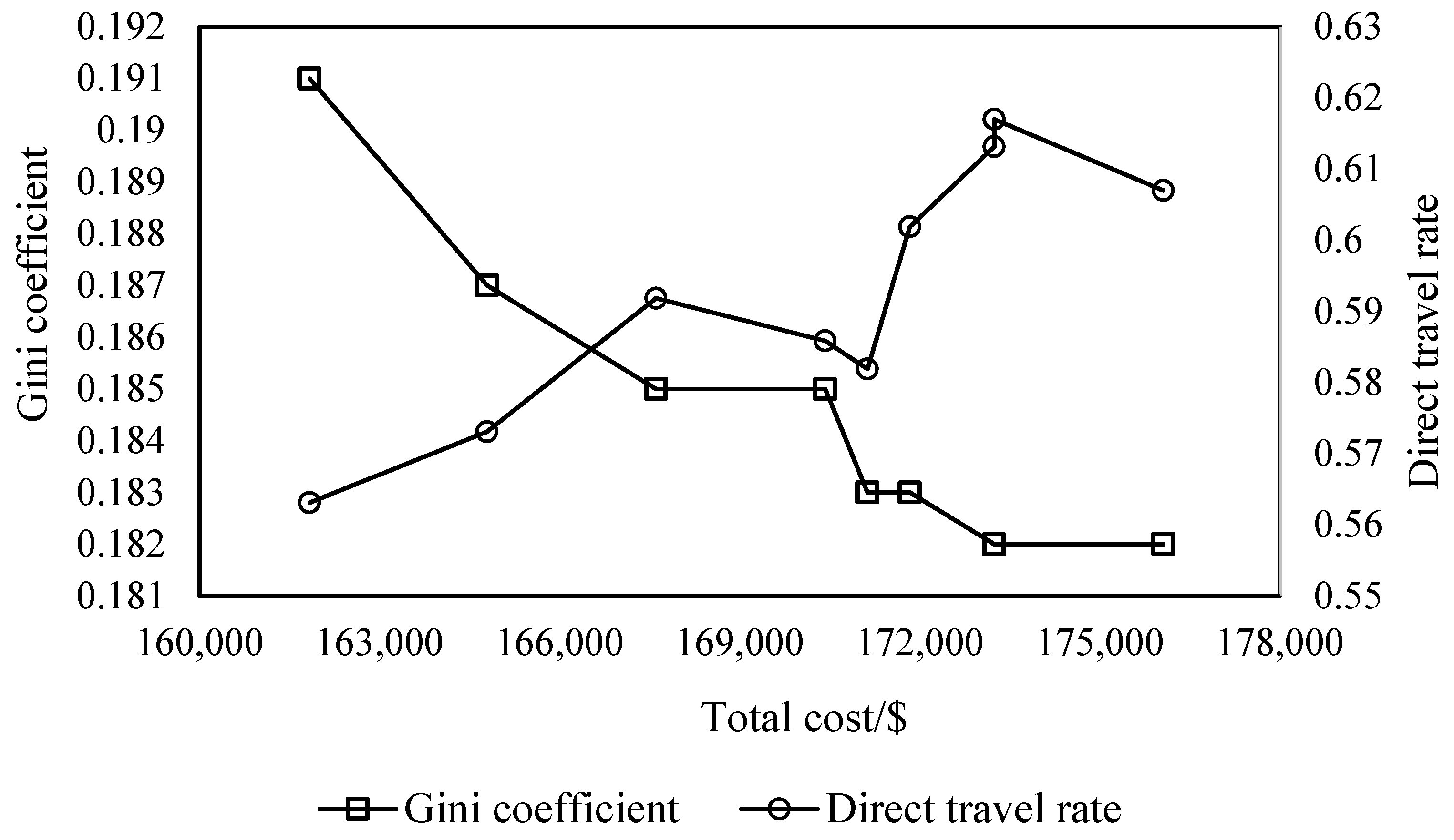 | Number of Bus Routes | Total Cost/$ | Gini Coefficient | Direct Travel Proportion of the Elderly |