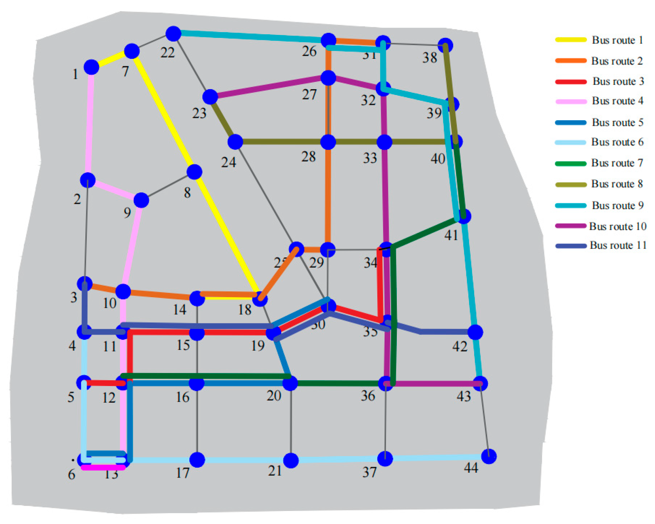 - Guihaire, V.; Hao, J.-K. Transit Network Design and Scheduling: A Global Review. Transp. Res. Part A Policy Pract. 2008, 42, 1251–1273. [Google Scholar] [CrossRef]