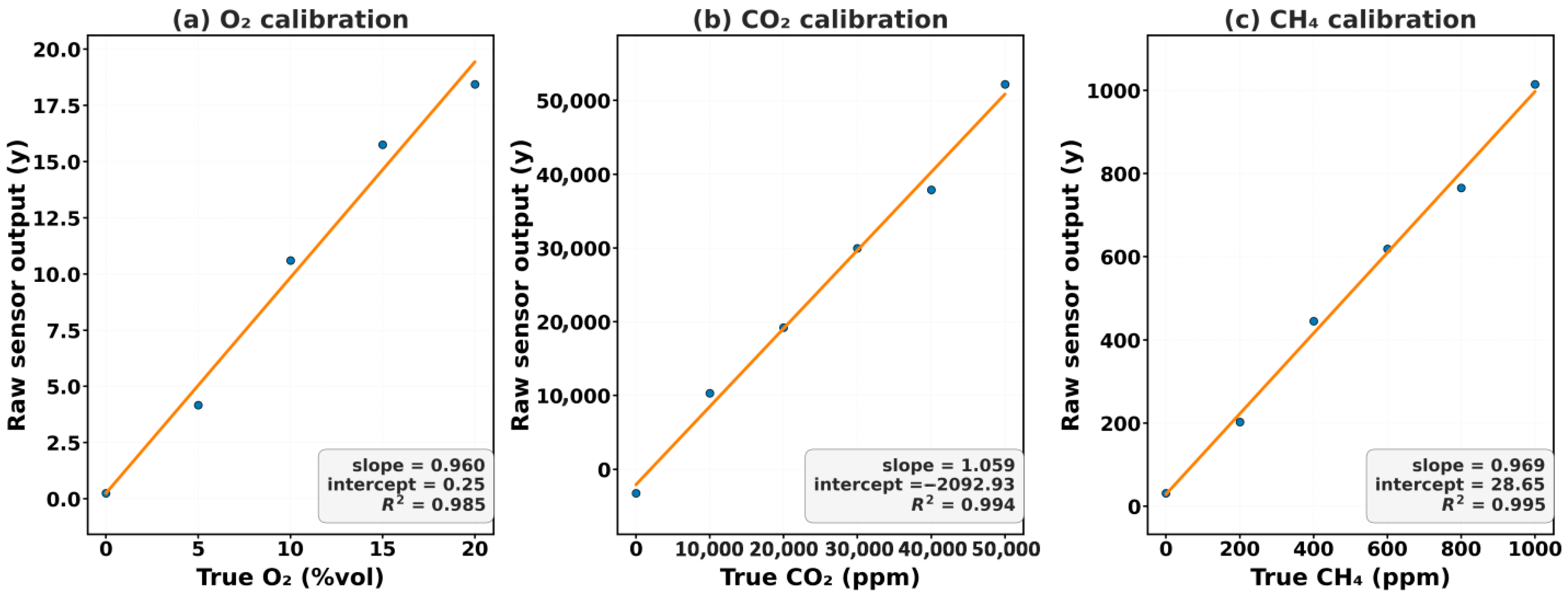 | Gas | Calibration Function | R2 | RMSE | U95 (≈1.96 × RMSE) |