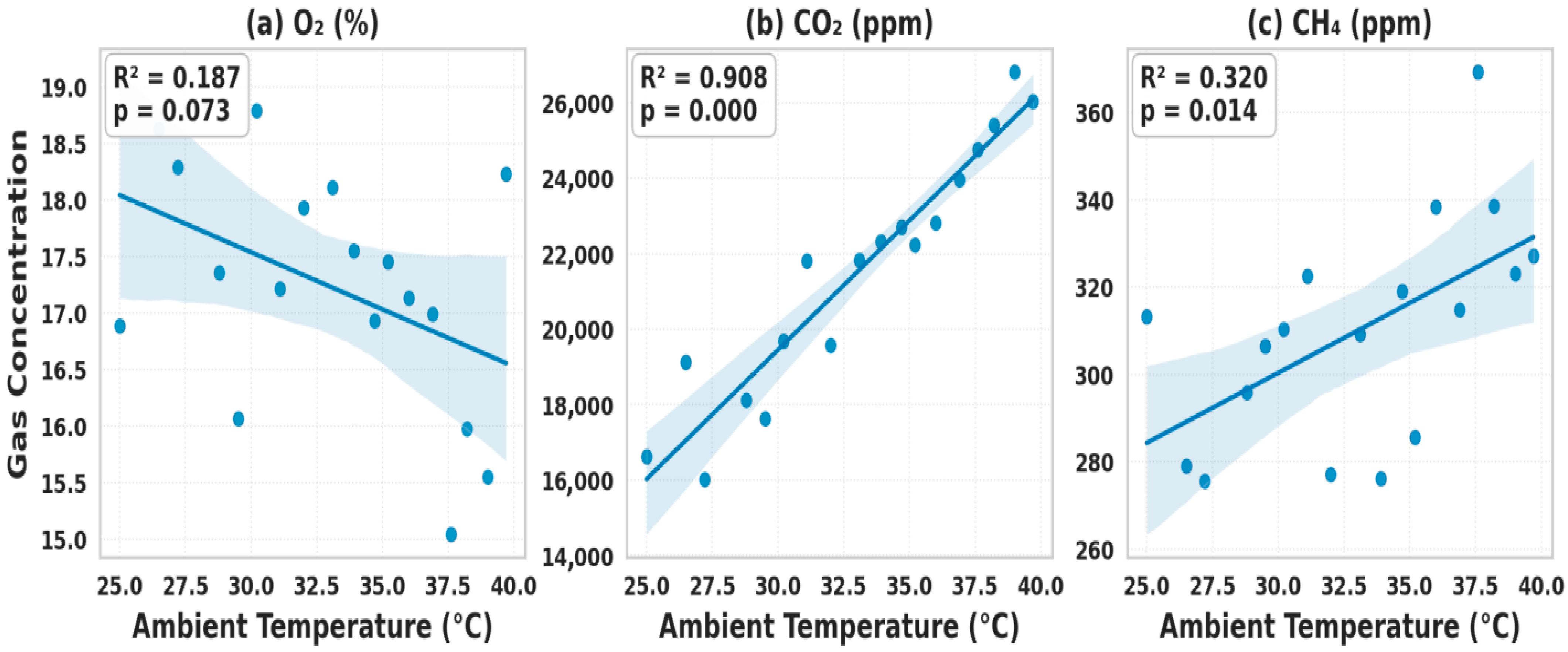 3.9. Influence of Ambient Temperature on Compost Gas Dynamics