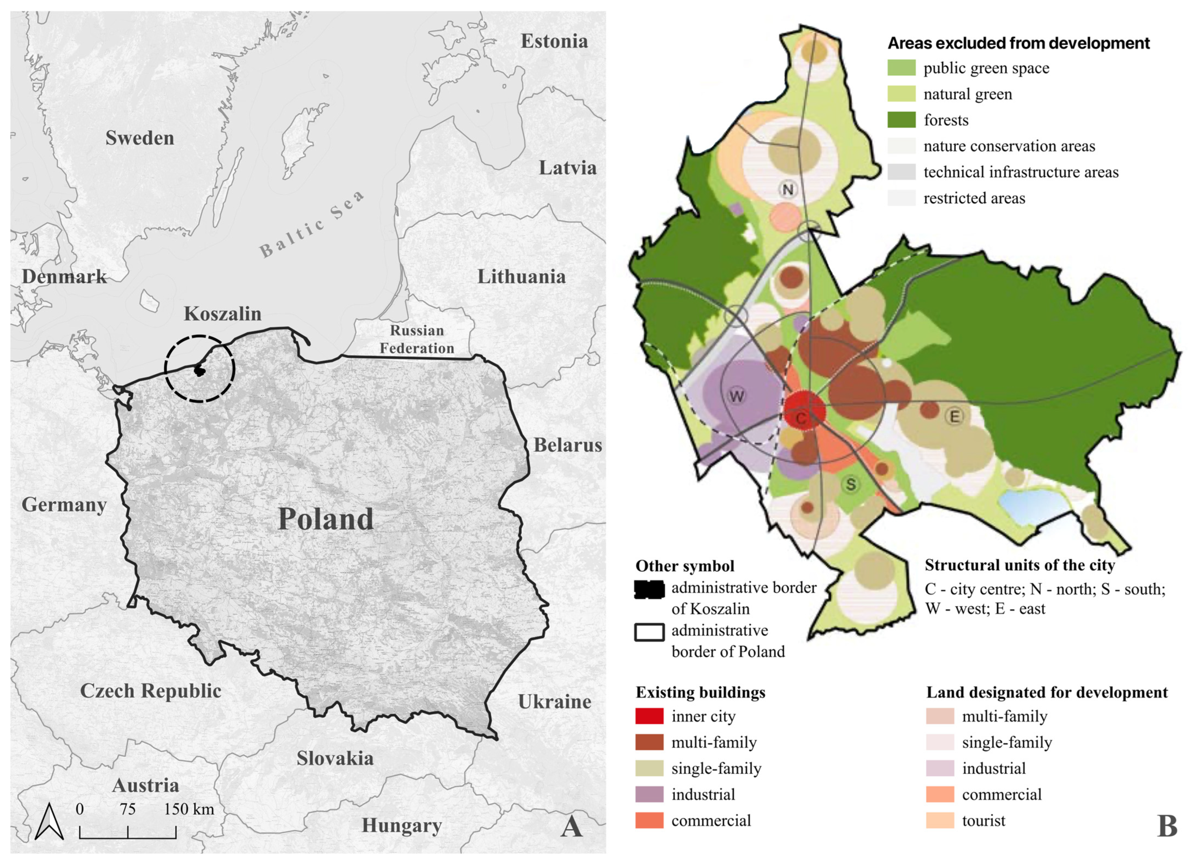 Figure 1. The geographical location of Koszalin and its functional and spatial structure ((A)—Geographical location; (B)—Functional and spatial structure). Source: Authors’ own elaboration based on the Openstreet Map resources and [9].