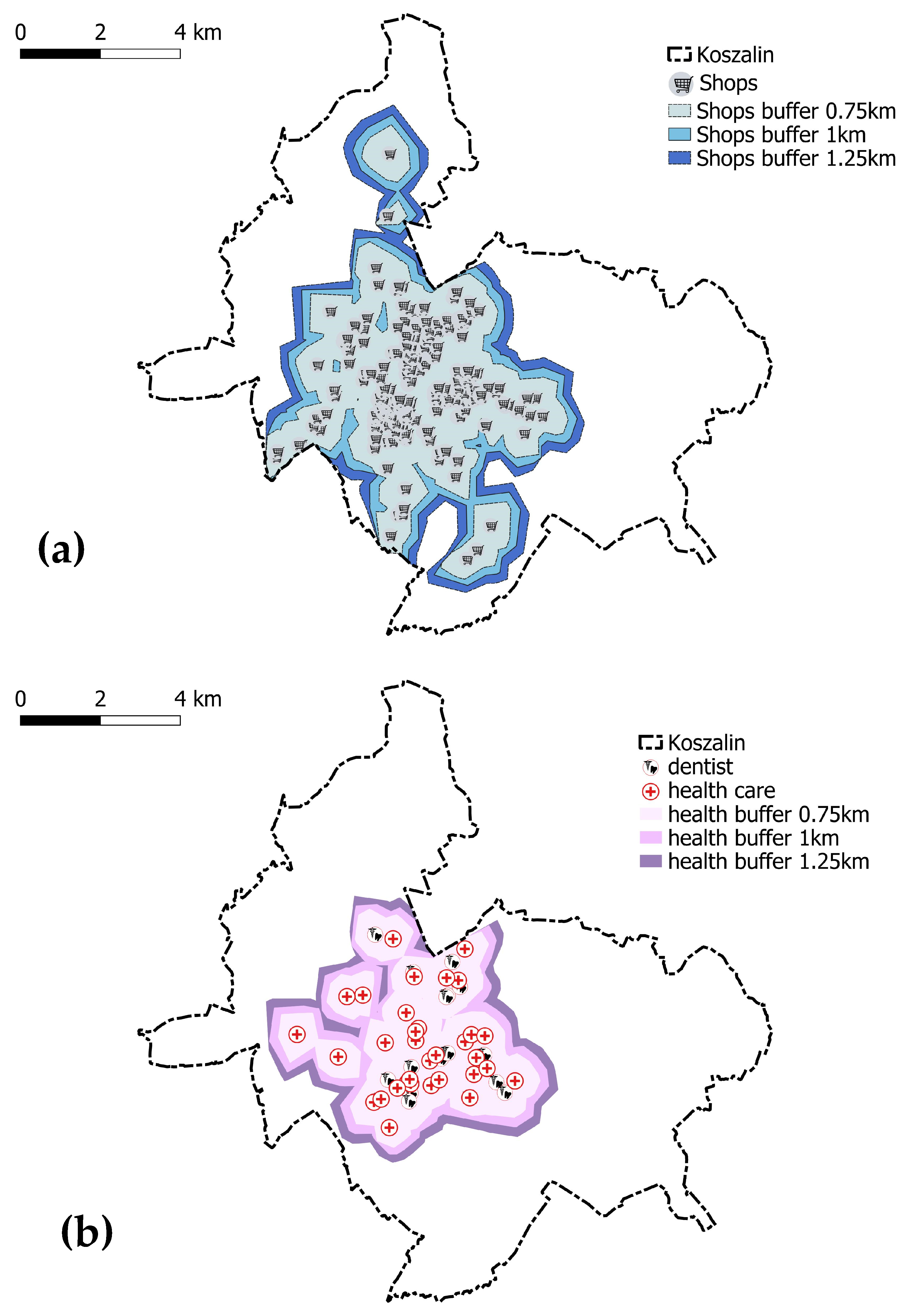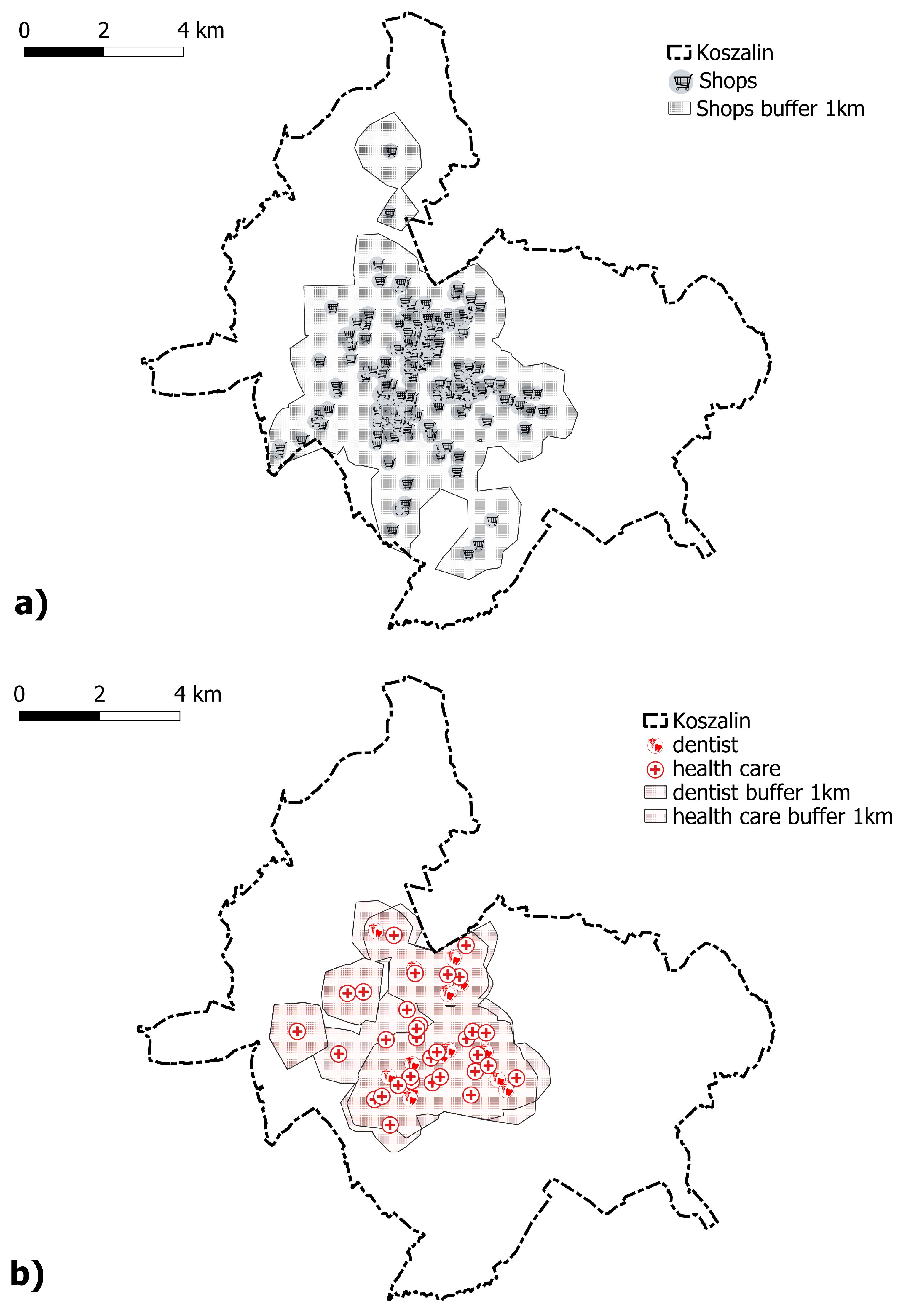 The 15 min city concept is based on ensuring that residents have access to essential services, including grocery stores, public healthcare facilities, nurseries, kindergartens, public primary schools, and public transportation. This involves identifying areas from which specific services can be reached on foot within a 15 min walk. These services are interpreted as point features on a map with particular coordinates. In the case of buildings, their locations were determined based on address data. A Geographic Information System (GIS) was used to determine the location of all services and to interpret spatial data. The analysis also included the location of public green areas, defined as spaces dedicated to outdoor recreation and leisure (physical activity).