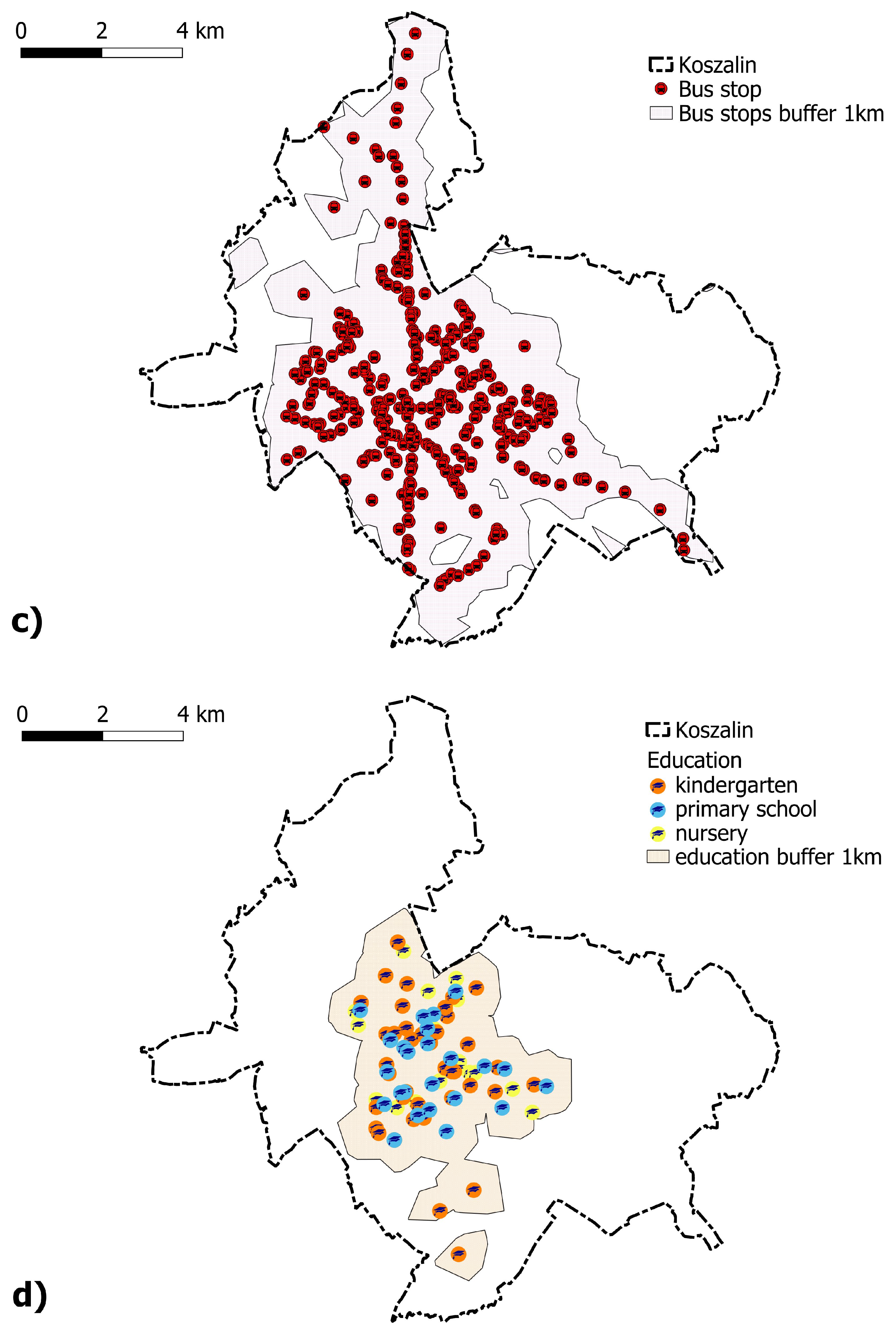 Table 4. Accessibility and spatial coverage of selected urban services in Koszalin.