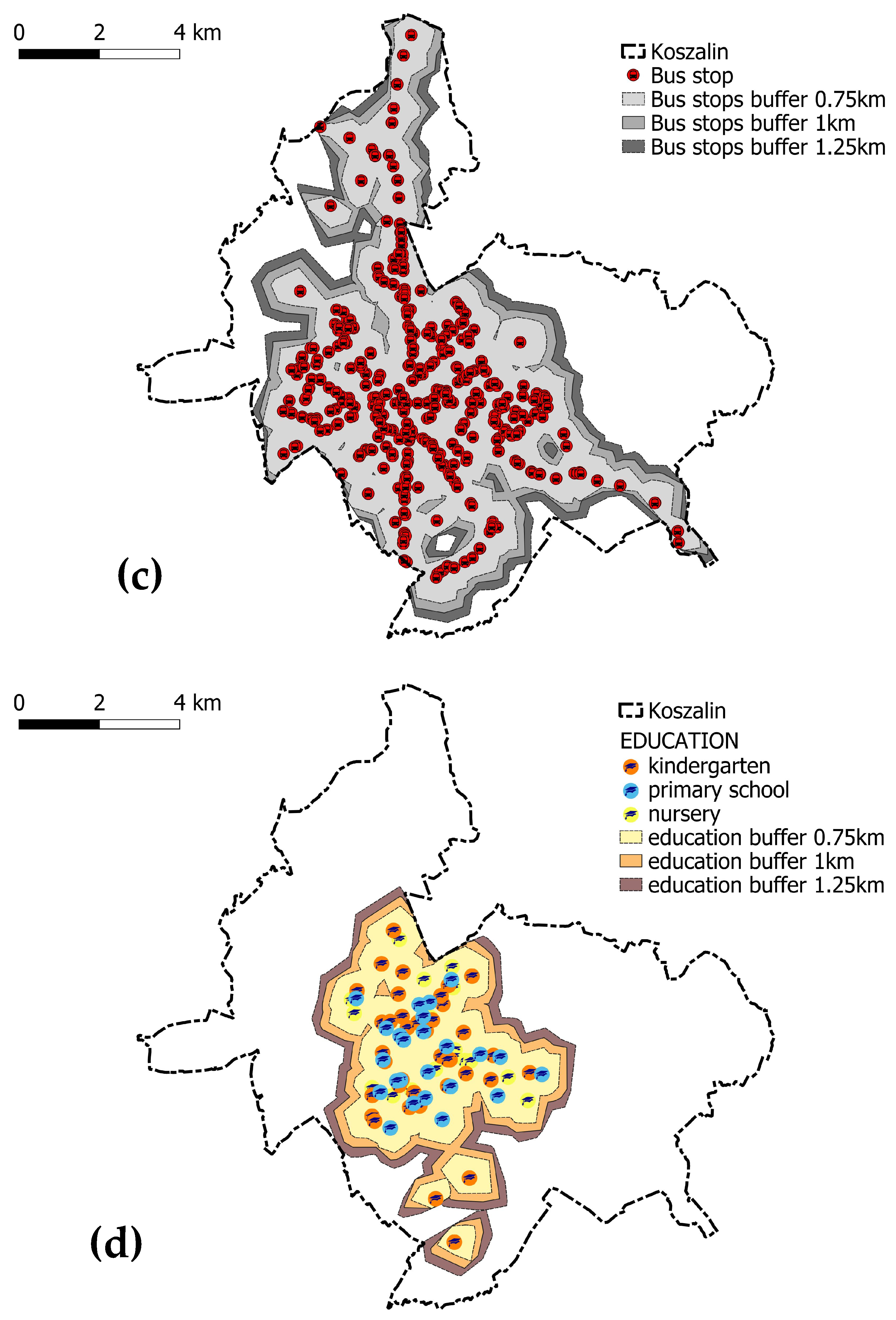 The answers to these questions provide a comprehensive assessment of the spatial potential of the medium-sized city of Koszalin for implementing the assumptions of the 15 min city model. In contemporary cities, spatial injustice constitutes a critical facet of social, economic, and environmental issues [11]. This study also enabled the identification of areas with deficits in access to essential urban services. The analysis points to priority directions for planning interventions that can strengthen the functional cohesion of the city, improve residents’ quality of life, and promote sustainable mobility. The findings have an applied character and may serve as a foundation for local spatial policies and revitalisation strategies that support the development of cities in line with the 15 min city concept.