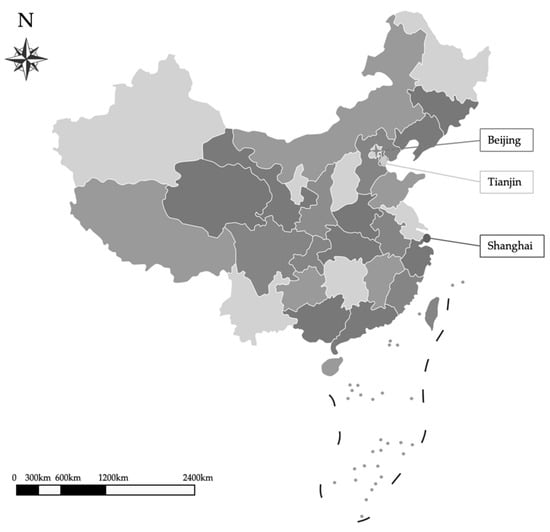 This study focuses on three urban areas located in Beijing, Tianjin, and Shanghai, all of which have been designated as pilot areas for IES under national policy initiatives. As shown in Figure 1, these areas are geographically distributed across northern and eastern China, providing representative areas for IES analysis. The selection of these areas is grounded not only in their roles as government-designated pilots but also in their shared institutional and socio-economic features. At the policy level, all three municipalities operate under the overarching framework of China’s 14th Five-Year Plan, which serves as the highest-level guideline shaping local energy and urban development strategies. Similarly, the IES White Papers released by national authorities provide the design and implementation blueprint for local-level energy transition policies, ensuring that pilot programmes follow a consistent strategic orientation [27]. At the demographic level, Beijing, Tianjin, and Shanghai are all centrally administered municipalities, directly governed by the central government. This status grants them similar governance structures, urban administrative hierarchies, and a high degree of policy implementation capacity, leading to broadly comparable sociodemographic characteristics such as population size, urbanisation levels, and household structures [53,54,55]. At the economic level, all three municipalities are characterised by service-oriented economies, dense residential populations, and diversified urban industries, reflecting a shared pattern of urban consumption and energy demand [56,57]. Together, these commonalities establish a stable foundation for IES analysis, as differences observed across the three areas are less likely to arise from structural disparities in governance, demographics, or economic base, and more likely to reflect genuine variations in consumer perception and acceptance of IES [58].