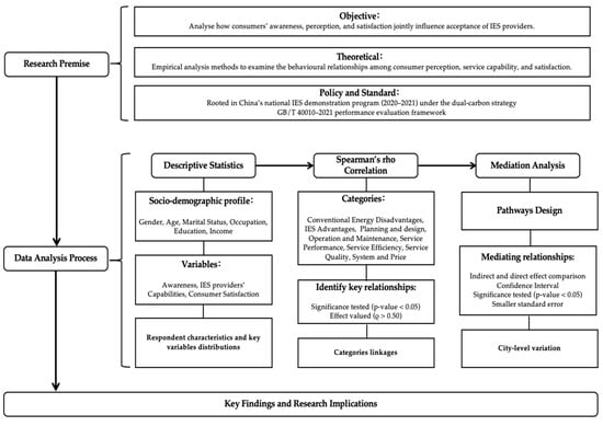 The data analysis framework outlined the overall analytical pathway adopted in this study, which connected descriptive statistics, correlation analysis, and mediation analysis to explain how consumer awareness and perceptions were transformed into acceptance of IES (see Figure 2). Descriptive statistics were first applied to summarise the characteristics of the survey data and provide an overview of the distribution patterns of key variables [78]. This included presenting the socio-demographic attributes of respondents (gender, marital status, age, occupation, education level, and monthly income) across the study areas. In addition, descriptive analysis was conducted for all measurement items of the questionnaire to report central tendency and dispersion. Specifically, the constructs of awareness, IES providers’ capabilities, and consumer satisfaction were summarised by showing the number of valid responses and missing values, as well as the minimum, maximum, and median scores for each indicator. These procedures established a comprehensive descriptive profile of the sample and the study variables, thereby serving as the foundation for subsequent analysis [79].