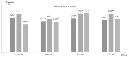 To identify the key pathways for further structural analysis, this study conducted Spearman Rho Correlation tests separately for each pilot city [105]. Although numerous correlations attained statistical significance, their strengths were not uniformly robust. To ensure that subsequent mediation analysis would be theoretically meaningful and statistically robust, only relationships with high correlation (ρ ≥ 0.50) and correlation significance at the 0.01 level were selected for further testing (see Figure 3). This threshold reflects common practices in social science research, where moderate to high correlations provide a sufficient basis for exploring mediating mechanisms, while weak correlations may not sustain meaningful causal inference [106,107].