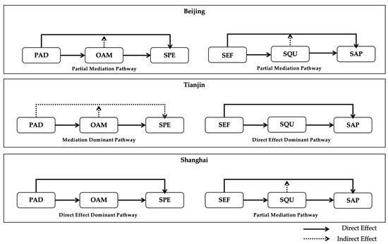In the mediation analysis, the direct effect represents the influence of PAD on SPE without accounting for the mediator, whereas the indirect effect captures the portion of this relationship that is transmitted through operation and maintenance [113]. Figure 4 and Table 7 present the mediation results for pathway 1 across Beijing, Tianjin, and Shanghai. In all three cities, both the direct and indirect effects were significant, confirming that OAM mediates the relationship between PAD and SPE. For Beijing, the indirect effect of PAD on SPE via OAM was 0.292 (95% CI [0.171, 0.425]), while the direct effect remained significant at 0.530 (SE = 0.082, p < 0.001). This indicates a partial mediation, where PAD influences SPE both directly and indirectly through OAM. For Tianjin, the indirect effect was even stronger (0.406, 95% CI [0.289, 0.541]), and the direct effect remained significant at 0.389 (SE = 0.079, p < 0.001). This again demonstrates partial mediation, with OAM playing a particularly substantial role in transferring the effect of PAD to SPE. For Shanghai, the indirect effect was weaker but still significant (0.185, 95% CI [0.087, 0.299]), while the direct effect was 0.457 (SE = 0.071, p < 0.001). This suggests that in Shanghai, PAD affects SPE mainly through a direct channel, but OAM nonetheless provides a meaningful complementary pathway.