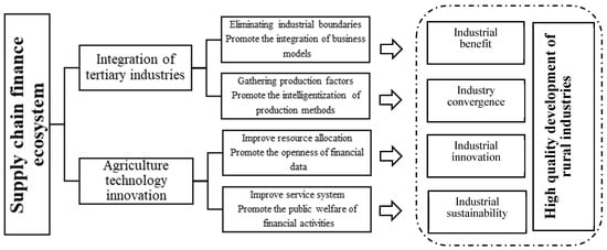 Internal growth dynamics theory posits that financial innovation serves as a key factor advancing technological progress and fostering capital accumulation, making it a key enabler of long-term economic growth []. By harnessing its distinctive strengths, the supply chain finance ecosystem significantly supports rural industry sustainability by optimizing industrial structures and production methods (see Figure 1).