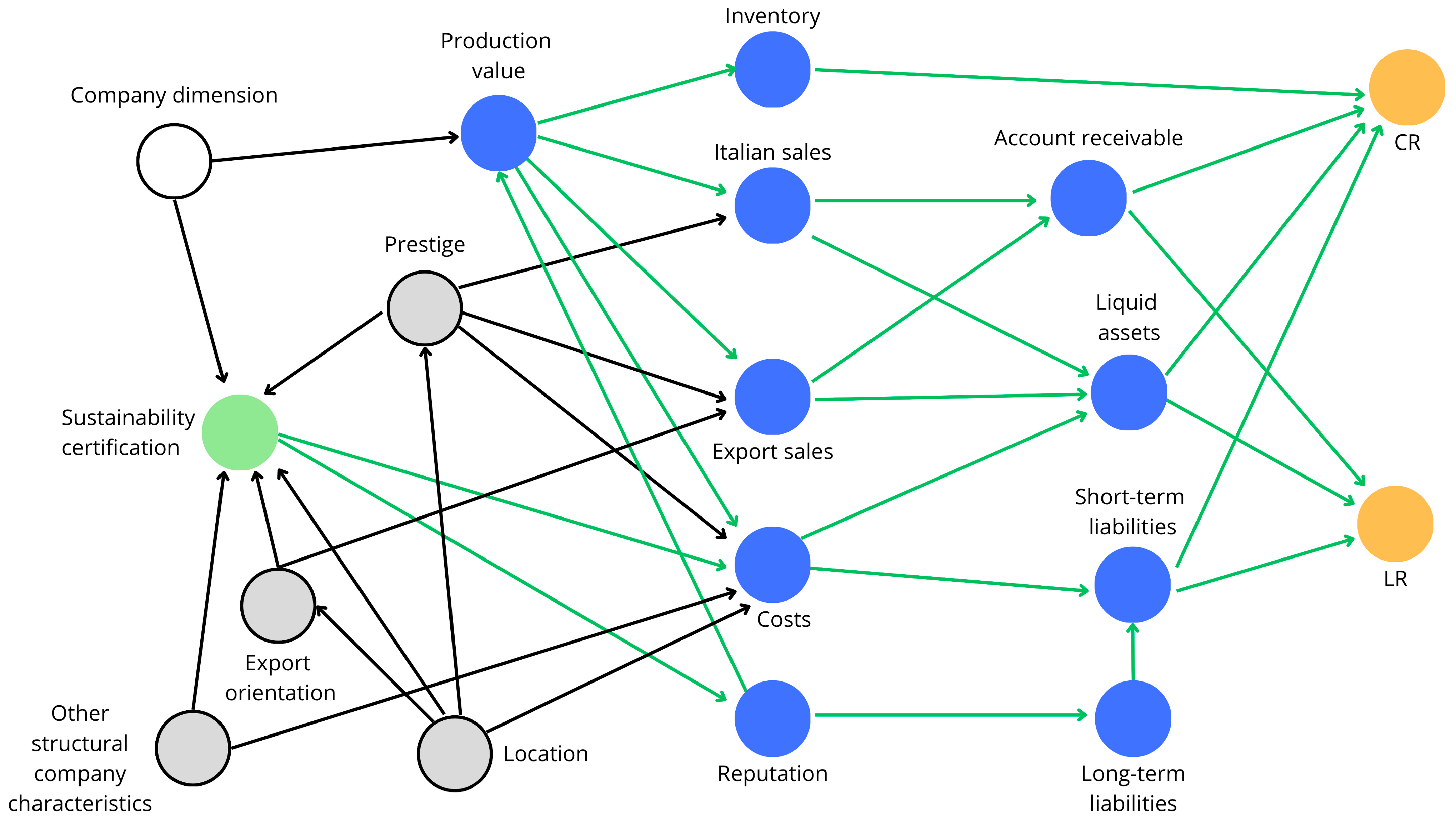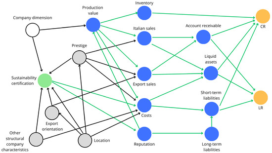 Figure 2. Directed Acyclic Graph—graphical representation of relationship between economic-financial variables in mediating the impact of sustainability certification on the liquidity indexes CR and LR. Legend: green circle= treatment, orange circle = outcome, blue circle = mediator, gray circle = unobserved confounder, white circle = observed confounder.