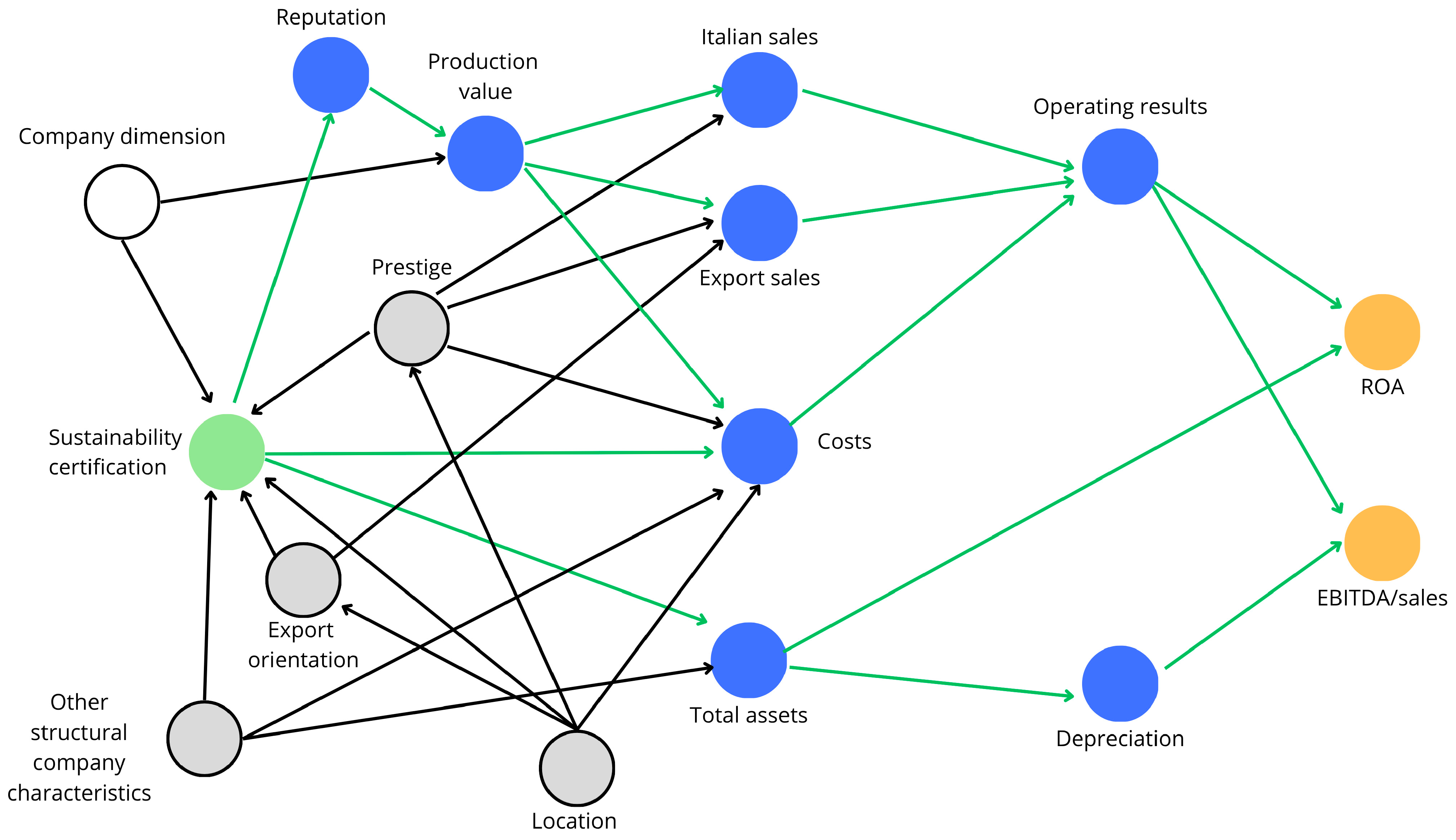 In terms of profitability, it is hypothesized that certification affects performance through three main channels. Operationally, certification (Sustainable certification in the figure) may lead to changes in the company’s cost structure (Costs). While sustainable practices could generate savings in the medium to long term (e.g., through increased efficiency), they may result in higher initial costs. In addition, the certification cost itself (i.e., the fee to pay to be certified) adds to the standard operating costs, increasing them. Higher operating costs, in turn, negatively affect the operating income (Operating results), influencing both EBITDA/Sales and ROA values.