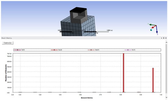 To balance computational accuracy and efficiency in the finite element analysis, appropriate meshing strategies were applied to different components of the model. The model consists of the subgrade, concrete base, PV module surface layer (made of PMMA), and PMMA sidewalls. Each component was meshed using different element sizes based on its structural role and stress characteristics. The meshing scheme is detailed in Table 3 and is visually illustrated in Figure 3. In this study, the supporting structure’s mesh employs the ANSYS secondary solid element SOLID186 (corresponding to Hex20/Wed15/Pyr13). The SOLID65 element, utilized for simulating the cracking behavior of the base, is excluded from the subsequent mesh quality statistics due to its unique integration scheme.