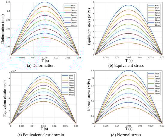 This study investigates the transient mechanical response of PV pavement modules under wheel loads, and presents time-history curves of deformation, equivalent stress, equivalent elastic strain, and normal stress, as shown in Figure 9. These curves exhibit symmetric parabolic (half-sine wave) characteristics, reflecting the dynamic loading and deformation behavior of PV modules during the wheel rolling process. The analysis reveals that the surface layer thickness has a significant influence on all physical quantities, with notable variations in peak response values across different thickness levels (ranging from 4 mm to 45 mm). The following discussion addresses each parameter in detail.