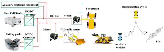 Recently, the frequency of extreme weather events has risen, indicating the increasing impact of global warming. To mitigate the consequences of climate change, there is an urgent need for clean energy to reduce carbon emissions. Environmental conservation efforts in the transportation sector are vital in this transition [1]. Engineering vehicles have traditionally presented challenges in reducing carbon emissions. The trend of electrification has become increasingly prominent in the modern transportation sector, with fuel-cell hybrid electric vehicles (FCHEVs) emerging as a viable alternative. The concept of the FCHEV was proposed by McElroy in 1983 and is a type of hybrid electric vehicle (HEV). Currently, combinations of fuel cell/battery and fuel cell/supercapacitor systems are being employed among the FCHEVs [2]. In a hybrid system, fuel cells and power batteries or supercapacitors are employed together to provide power, offering multiple operating modes and numerous advantages for hybrid vehicles [3,4,5]. However, due to variations in the optimal operating ranges of different power sources, energy management strategies (EMSs) are designed to optimize the allocation of each power source based on vehicle operating conditions. Consequently, EMSs have emerged as an important area in FCHEV research [6].