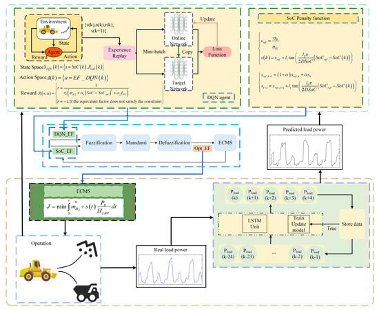 Specifically, the LSTM model first performs short-term power prediction based on historical load data, providing forward-looking information for upper-layer decision-making. The DQN agent then takes the predicted power, SoC status, and energy consumption feedback as inputs and outputs DQN_EF. Meanwhile, the SoC penalty function generates SoC_EF according to the deviation of the SoC to maintain the stability of the battery’s state of charge. Subsequently, the fuzzy logic module takes DQN_EF and SoC_EF as inputs, applies rule-based reasoning, and outputs Opt_EF, which is then passed to the lower-layer ECMS for power distribution. The energy management architecture proposed in this article is illustrated in Figure 2. The process description is shown in Algorithm 1.