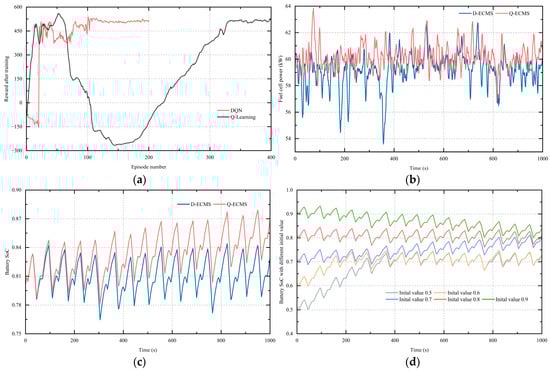 (a) Trained agent reward; (b) fuel cell power under different EMSs; (c) battery SoC under different EMSs; (d) battery SoC under different initial values.