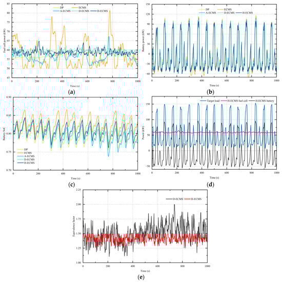 Analysis of different EMSs. (a) Fuel cell power under different EMSs; (b) battery power under different EMSs; (c) SoC under different EMSs; (d) fuel cell-lithium battery power follower; (e) optimal equivalent factor values for different EMSs.