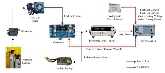 The EMS performance was verified by hardware-in-the-loop experiments, comparing diverse EMS algorithms. Each experiment used a PXIe system and LabVIEW instrument with electronic loads simulating construction machinery power requirements. The EMS calculated optimized control variables, delivering fuel cell output power to the unidirectional DC/DC. The control period was 1 s, with a 200 ms sampling period. Table 5 shows the experimental equipment parameters. Figure 7 illustrates the connection layout of each component in the hardware-in-the-loop experimental platform.