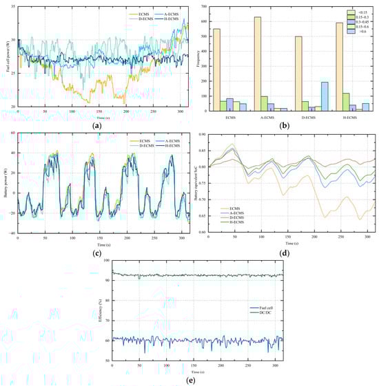 Experimental analysis of different EMSs. (a) Fuel cell power under different EMSs; (b) histogram of the fuel cell power under different EMSs; (c) battery power for different EMSs; (d) battery SoC for different EMSs; (e) real-time efficiency with H-ECMS.
