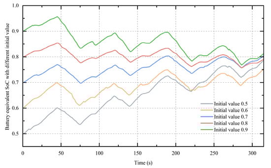The H-ECMS’s experimental results for diverse initial SoC values (0.5, 0.6, 0.7, 0.8, 0.9) are presented in Figure 9. Under the initial SoC of 0.6, the minimum termination value was 0.75. For an initial SoC of 0.9, the maximum termination value was 0.81, while other values converged around 0.8. These results demonstrate the H-ECMS’s strong performance and adaptability across different initial SoC values.