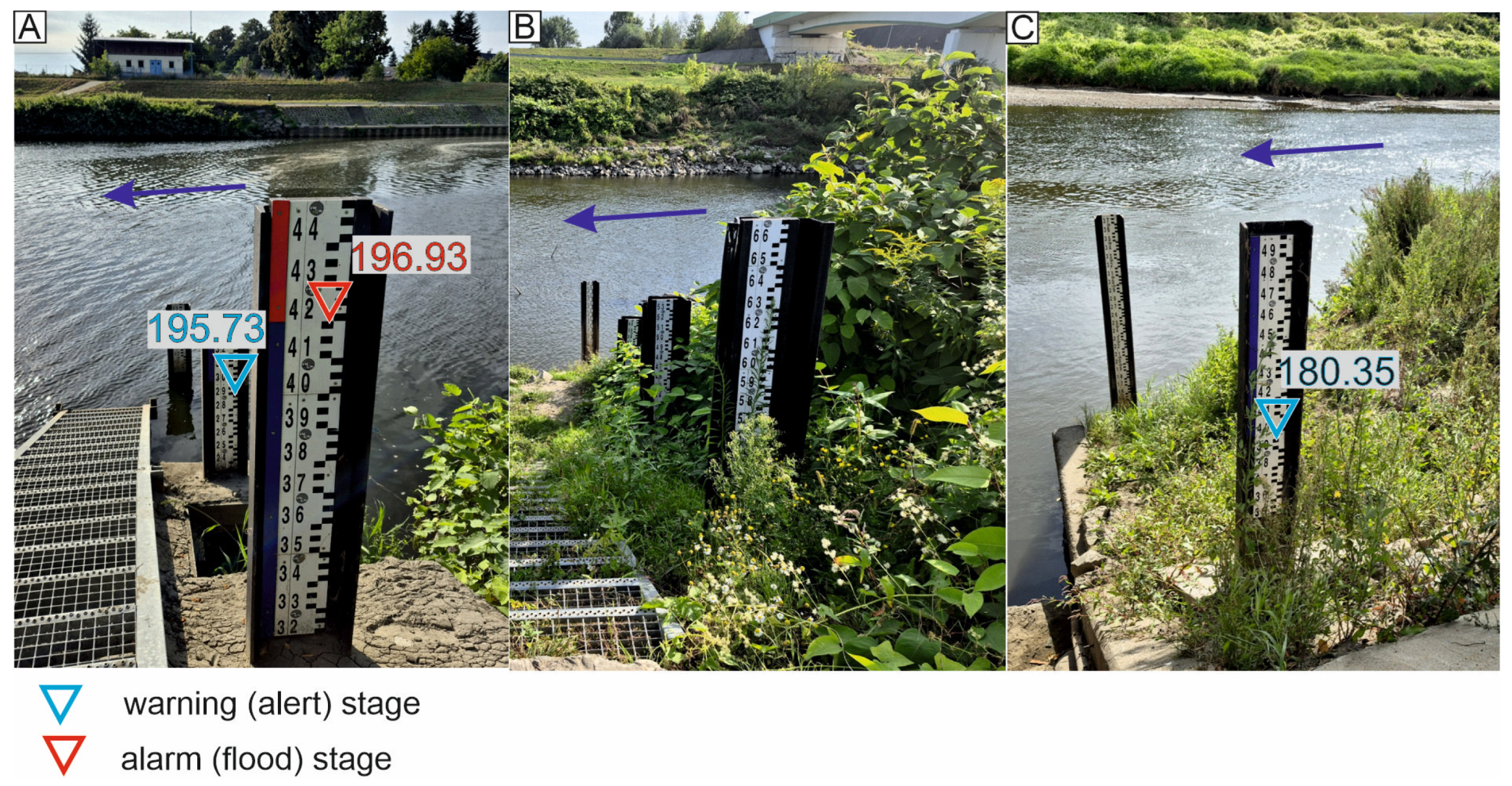 Figure 3) in the Upper Odra River, Chałupki, Krzyżanowice, Racibórz-Miedonia. The Institute of Meteorology and Water Management—a national research institute in Warsaw (Poland)—collects these hydrological data. We present the hydrological data covering floodwaves on hydrographs from three different flood events (1997—two months, 2010—two months, 2024—one month, as the event lasted shorter than earlier ones), and we use basic data frequency, i.e., one water stage value per day. Elevation on the hydrographs and everywhere in the text are recalculated to the PL-EVRF2007-NH geodetic system—a part of the European Vertical Reference System (tide gauge in Amsterdam). Additionally, on these hydrographs, we mark a warning stage and an alarm stage. The stage names are word-for-word translations from the Polish vocabulary used by the Institute of Meteorology and Water Management; however, more exact English names might be given as “alert stage” and “flood stage”.