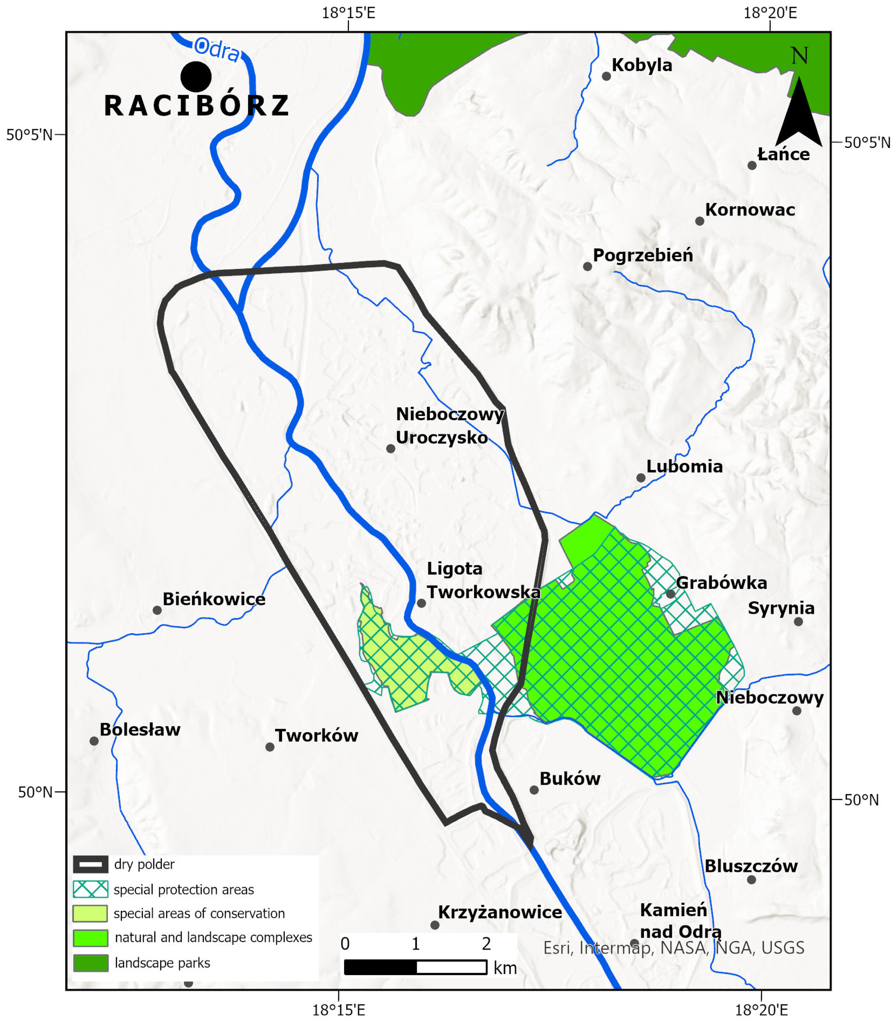 45]. In this case, the scale of the facility increases, but this also increases its impact. It seems that a dry polder like Racibórz Dolny could be the first example of large-scale green infrastructure. It is also a response to the dramatic history of the Odra Valley in terms of high floods.