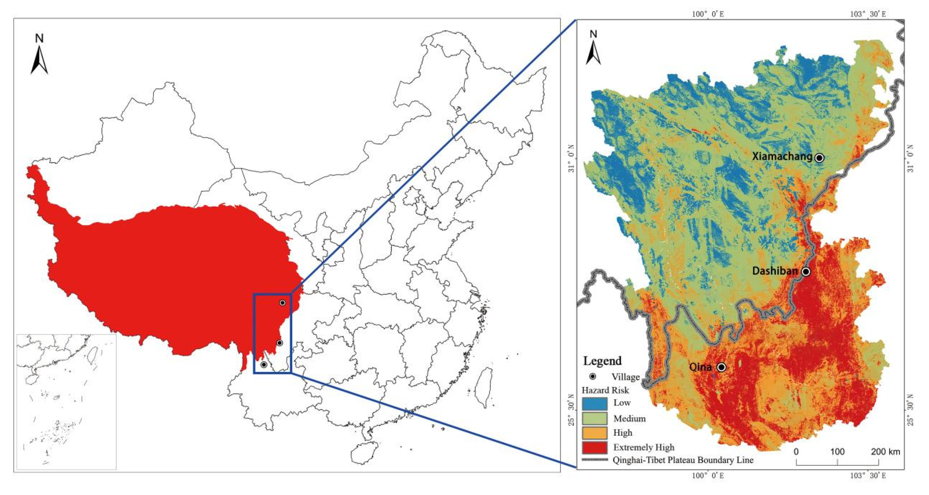 Hengduan Mountains Region, as a typical representation of the western mountainous regions in China, is characterized by high-frequency and high-intensity natural disasters, unique and complex interactions of terrain, humidity, and geological conditions, active disaster-predisposing environments, vulnerable elements at risk, and mutated hazard-causing factors [23]. It stands as one of the most concentrated areas for mountain hazard development and one of the most severely disaster-affected regions [24]. Meanwhile, in the Hengduan Mountains region, mountainous areas account for over 90% of the total area. The distribution of villages exhibits a pattern of “large-scale dispersion and small-scale clustering”. The occurrence of mountain disasters has a particularly severe impact on the economic development of mountain villages. Based on the principles of representativeness and typicality, and considering factors such as village geographical characteristics, transportation conditions, socio-economic levels, and the main industries of villagers, using the hazard risk map of the Hengduan Mountains Xu et al. [25] as the base map, three villages with risks ranging from low to high were selected as study samples along the northeast-southwest direction of the southwestern transitional zone of the Qinghai–Tibet Plateau (see Figure 2). These villages are Xiamachang Village in Meixing Town of Xiaojin County (Aba Prefecture), Dashiban Village in Huiping Township of Mianning County (Liangshan Prefecture), and Qina Village in Qina Town of Yongsheng County (Lijiang City).
