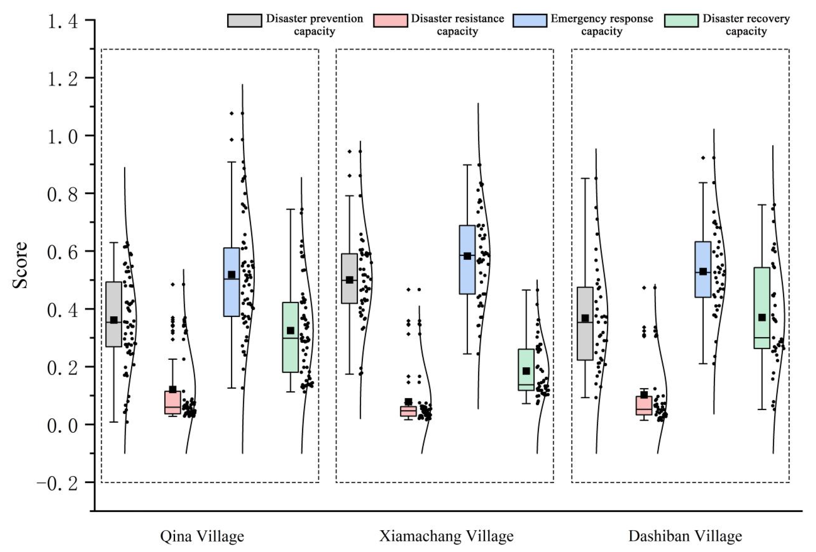 Figure 5. Boxplot of disaster prevention, resistance, relief, and recovery capacity scores for typical villages.