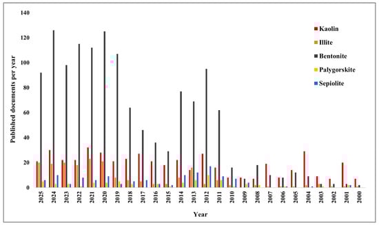 The yearly production of fly ash in the US, Canada, UK, Germany, Australia, France, Denmark, Italy, the Netherlands, India, and China is 75, 6, 15, 40, 10, 3, 2, 2, 2, 112, and 100 million tons, respectively and among them only 20% is being used in the construction sector, worldwide [25]. However, the supply of traditional SCMs, such as fly ash, is expected to decline due to rising demand for carbon neutrality across industries, ongoing construction, and the decline of coal-fired power stations [26,27]. Given the global distribution disparities, it’s uncertain whether blast furnace slag, silica fume, and other industrial byproducts will be available in sufficient quantities to meet rising demand [28,29]. Therefore, current research should focus on converting locally available natural clay, waste, or contaminated soil, mud, and sewage sludge into pozzolanic SCMs. Among them, natural clay can be a potent option due to its worldwide availability, cost-effectiveness, and eco-friendliness, as it is an earth-based material with various mineral contents [30]. Being an abundant source of silica and alumina, clay can be effectively used as a pozzolanic material through proper surface activation modification [31,32]. However, there are some criteria to choose a clay as an SCM. According to ASTM, the total amount of SiO2, Al2O3, and Fe2O3 should be at least 70% by weight, ≤34% should be retained on a 45 µm sieve, the moisture content should be ≤3.0%, and the Strength Activity Index (SAI) should be at least ≥75% than that of the control mix [33]. Although clays have significant potential as SCMs, there appears to be limited effort among researchers to investigate specific clay types and their suitability for these applications. Figure 1 illustrates the research trend about different natural clays over the past 25 years, as collected from the Scopus database.
