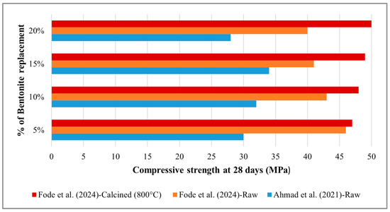 | 800 | 3 | A 20% replacement of OPC with calcined bentonite at 800 °C showed the highest pozzolanic activity compared to the replacements at 400 °C and 600 °C. | [142] | |
