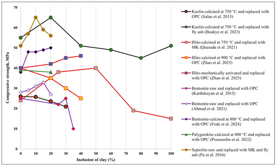 | Palygorskite | 800 | 1 (300 °C/h) | Enhanced pozzolanic reactivity was exhibited when 10% of the OPC was replaced. | [79] |