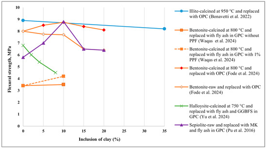 Previous research indicates that the ideal calcination temperature for Palygorskite is 700–800 °C, with a duration of 1–3 h. Poussardin et al. [82] reported that Palygorskite calcined at 800 °C for 1 h exhibited the highest pozzolanic reactivity. Whereas Georgopoulos [150] and Hamid et al. [151] reported, at 750 °C, Palygorskite exhibited the highest pozzolanic reactivity in both OPC and geopolymer composites. Limited research has shown that the optimal calcination temperature for Sepiolite is between 800 °C and 900 °C. The study by Wu et al. [152] attributed the highest pozzolanic activity to the Sepiolite samples calcined at 800 °C. Another study by Saka et al. [153] reported that Sepiolite calcined at 900 °C, and replaced with 10% OPC, exhibited superior mechanical properties in the presence of 3% glass fibre.